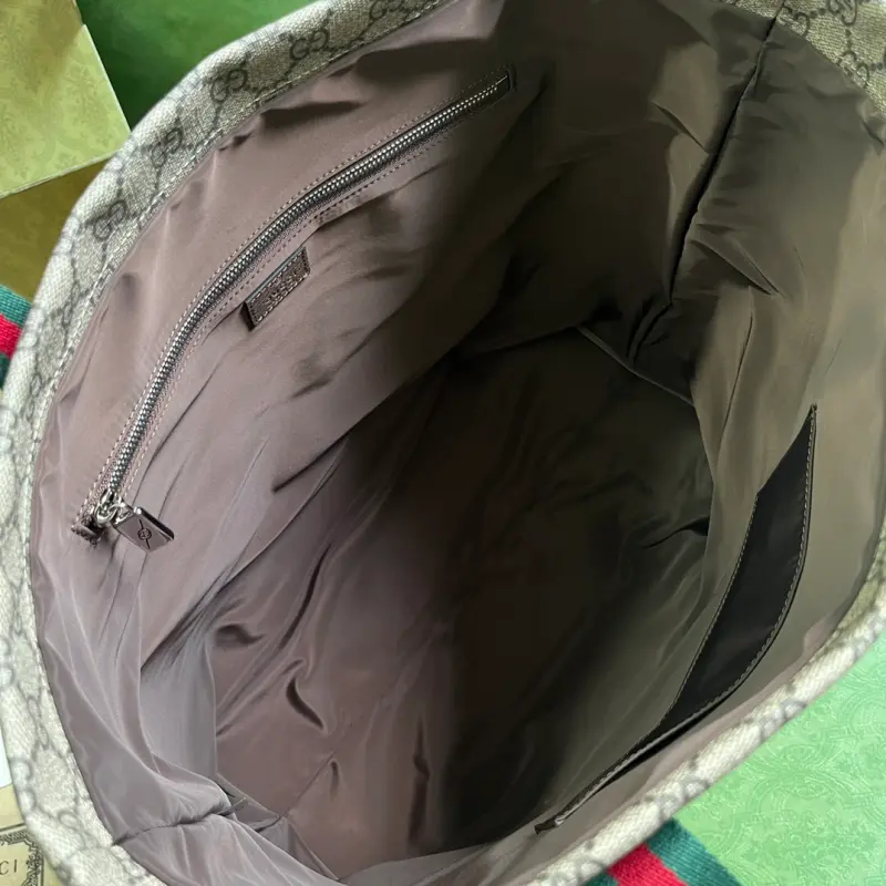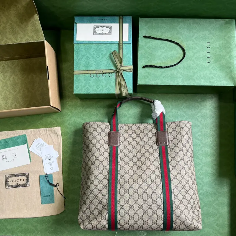 Comes with a complete set of original green gift bags: GG Tender medium tote bag. GG Supreme Tender canvas embodies the charm of the men’s accessories collection, its soft material and durability injecting a contemporary touch into the brand’s classic design. The classic red and green web adds to the charm of this tote bag. Beige and ebony GG Supreme Tender canvas, red and green grosgrain web, nylon lining, one zipper pocket, and handles (11 cm drop). Model No. 763287. Dimensions: 39 (length) x 41 (width) x 16 cm (depth). Color: Brown/PVC. Made in Italy