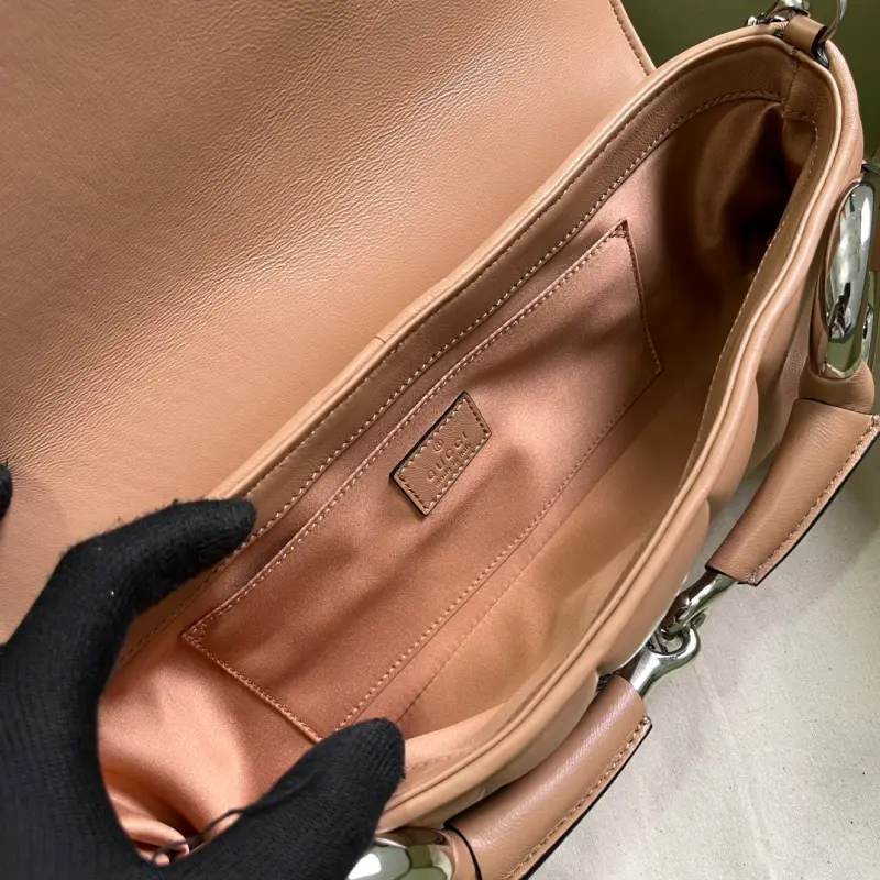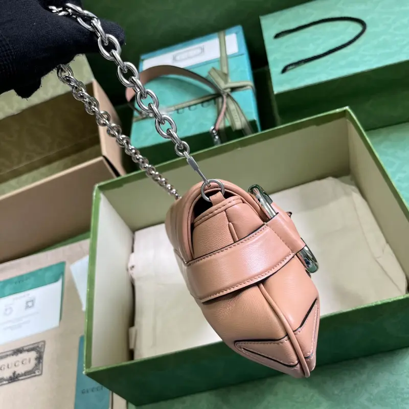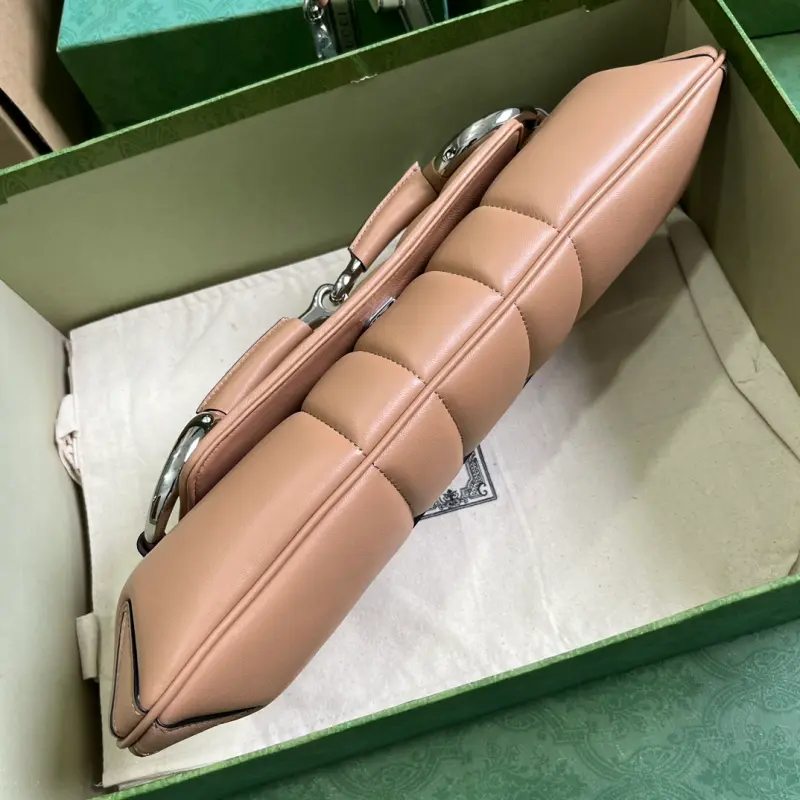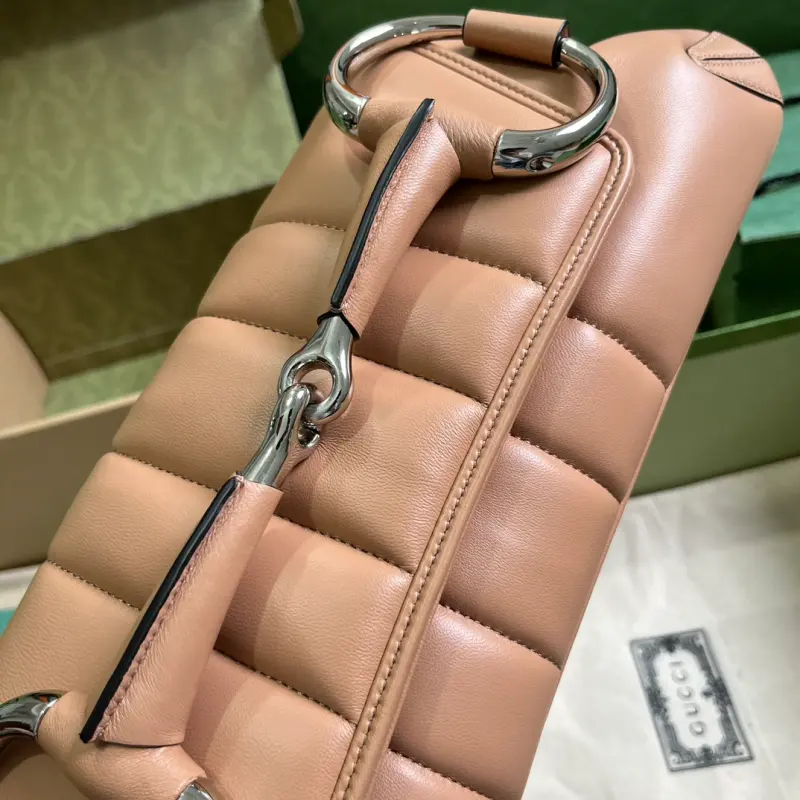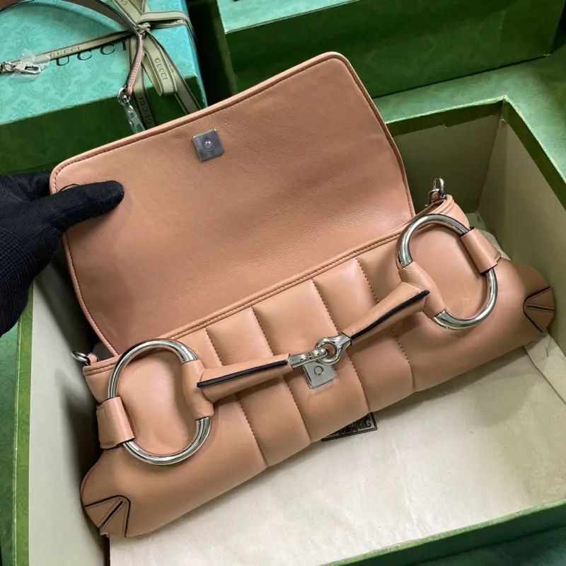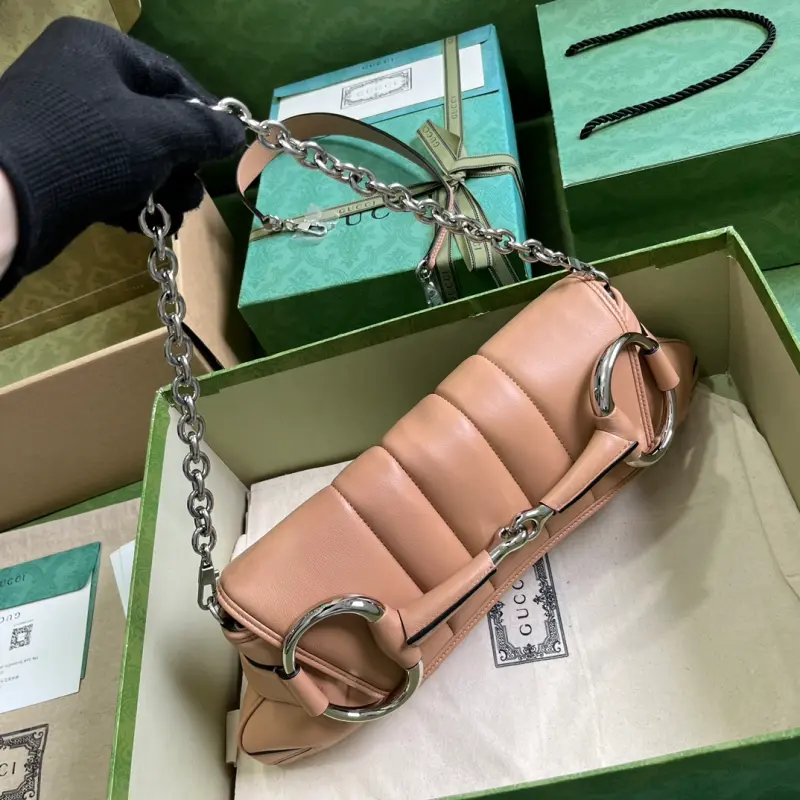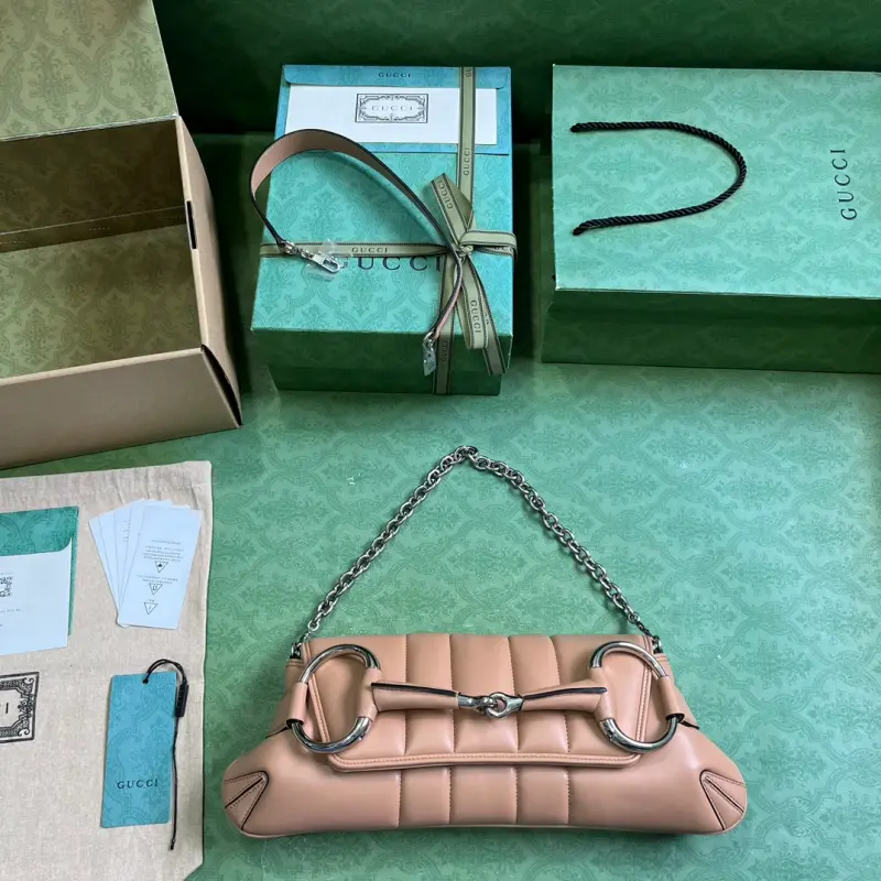 The Gbag Horsebit Chain Medium Shoulder Bag (Includes Full Original Green Box) showcases a reimagined Gbag icon, skillfully blending archival design with contemporary innovation to embody a contemporary aesthetic. This bag, meticulously embellished with the horsebit design, a signature element of the brand from the early 2000s, celebrates the brand’s heritage. For the Fall/Winter 2023 collection, this bag features a contemporary twist in a variety of colors and textures. It features rose beige quilted leather with palladium hardware. As a select item with the Gbag Tag, this item is NFC-enabled for authenticity verification and a digital innovation. It features a horsebit closure, interior: a card compartment and pocket, detachable leather strap (21 cm drop), detachable chain shoulder strap (20.5 cm drop), and magnetic snap closure. Weight: Approximately 0.7 kg. Model No. 764255. Dimensions: 38 cm (width) x 15 cm (height) x 16 cm (depth). Color: Rose beige/original leather.