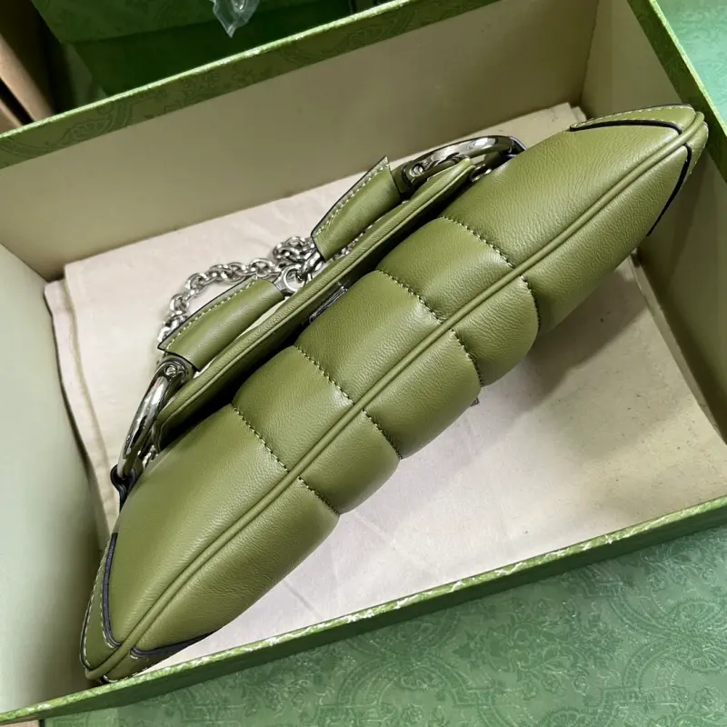 [Includes full original green box packaging] Gbag Horsebit Chain series small chain shoulder bag. Gbag reinterprets classic house elements, skillfully blending archival designs with modern innovations to showcase a contemporary aesthetic. This handbag is ingeniously embellished with the horsebit design, popular in the early 2000s, inheriting the house’s heritage. This handbag has been updated for the Fall/Winter 2023 collection, using a variety of colors and textures to create a contemporary style. Green quilted leather with palladium-tone hardware and horsebit buckle. Interior: a card compartment and pocket, detachable leather strap (23 cm drop), detachable chain shoulder strap (19 cm drop), and magnetic snap closure. Model No. 764339. Dimensions: 27 cm (width) x 11.5 cm (height) x 5 cm (depth). Color: Green/Original Leather.