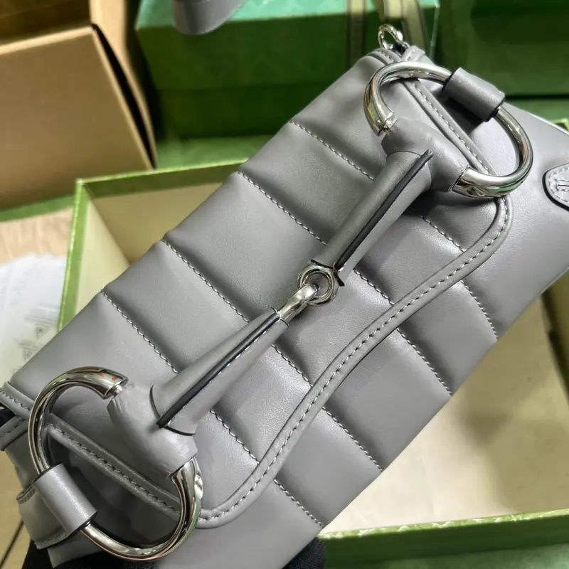 [Includes full original green box packaging] Gbag Horsebit Chain small shoulder bag. Gbag reinterprets classic house elements, skillfully blending archival design with modern innovation to showcase a contemporary aesthetic. This handbag, ingeniously embellished with the horsebit design, a signature element of the house from the early 2000s, celebrates the house’s heritage. Reimagined for the Fall/Winter 2023 collection, this bag showcases a contemporary aesthetic with a variety of colors and textures. Made of gray quilted leather with a palladium-tone horsebit hardware, the interior features a card compartment and pocket, a detachable leather strap (23 cm drop), a detachable chain shoulder strap (19 cm drop), and a magnetic snap closure. Model No. 764339. Dimensions: 27 cm (width) x 11.5 cm (height) x 5 cm (depth). Color: Gray/original leather.