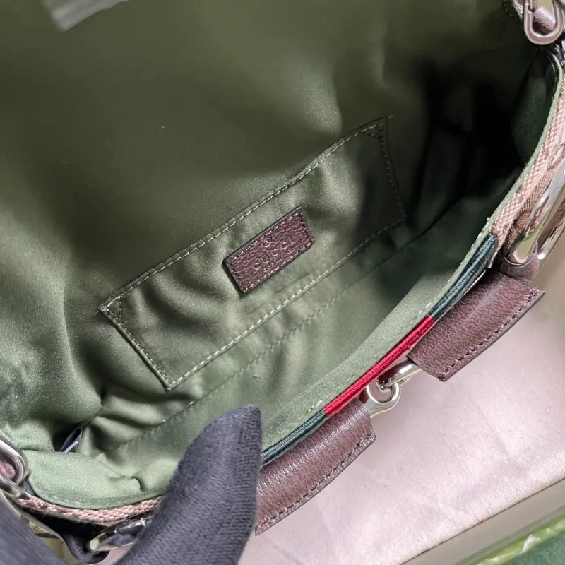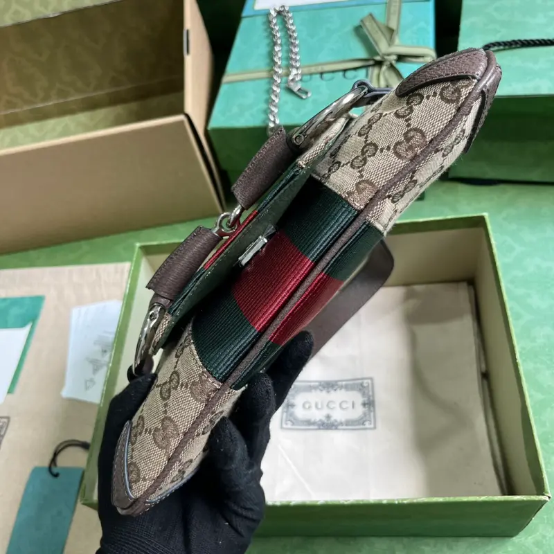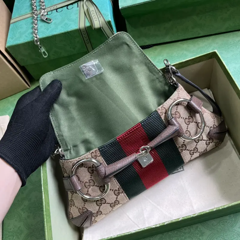 [Comes with a full set of original green box packaging] Gbag Horsebit Chain small shoulder bag. Gbag reinterprets the brand’s classic elements, cleverly blending archival design with fashionable creativity to showcase contemporary aesthetics. This handbag is ingeniously embellished with the horsebit design that was popular in the early 2000s, inheriting the brand’s classics. This handbag has been reinterpreted in the 2023 Fall/Winter series, using a variety of colors and textures to present a contemporary style. Beige and ebony classic GG canvas, brown leather piping, palladium-tone hardware, red and green web. As a selected item with a Gbag Tag, this product supports NFC technology to help you verify authenticity and enjoy a digital innovation experience. Horsebit, interior: a card compartment and pocket, detachable leather bag strap (23 cm high) detachable chain shoulder strap (19 cm high) magnetic snap closure. Model: 764339. Dimensions: 27 (width) x 11.5 (height) x 5cm (depth) Color: brown/canvas. Made in Italy