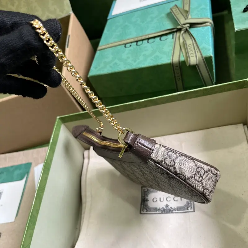 [Includes full original green box packaging] Ophidia mini handbag. The Ophidia collection continues to grow, introducing a variety of unique shapes and materials each season. This mini handbag is expertly crafted from brown and white GG Supreme canvas and cleverly embellished with Double G hardware. Made of brown and white GG Supreme canvas with brown leather trim, gold-tone hardware, and a cotton and linen blend lining with Double G. Interior: one open pocket, chain top handle (18 cm drop), and top zip closure. Weight: Approximately 0.32 kg. Model No. 764960. Dimensions: 10 cm (length) x 19 cm (width) x 3 cm (depth). Color: Brown/PVC.