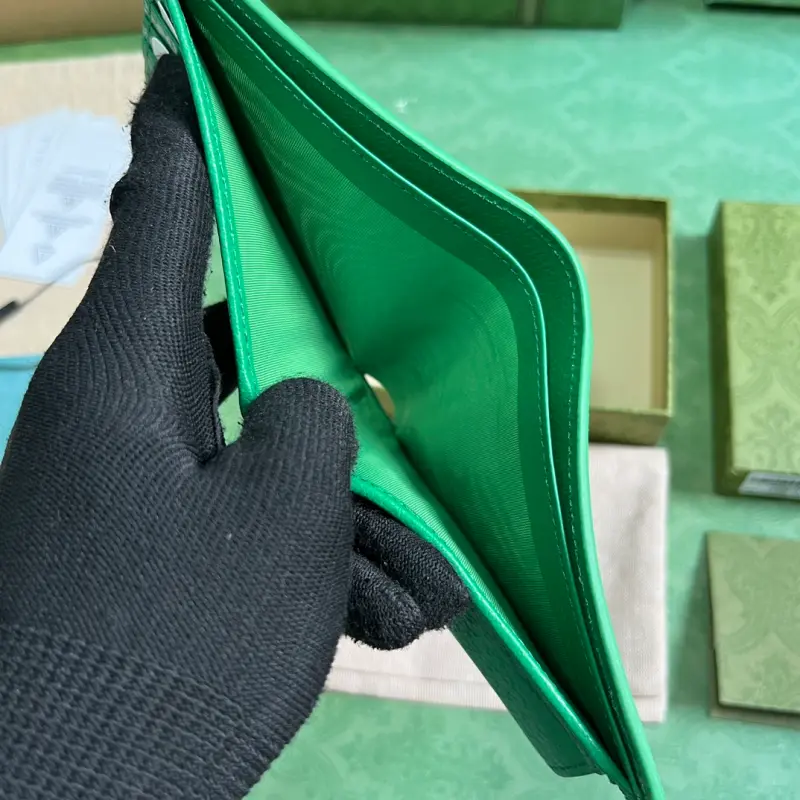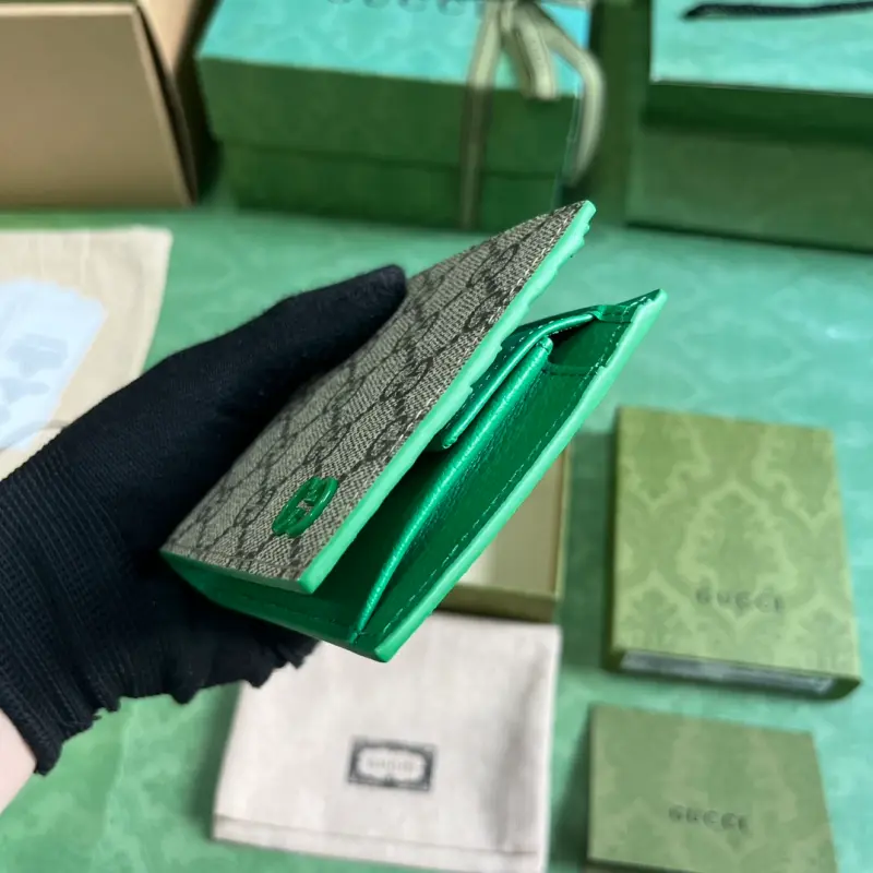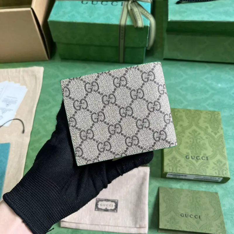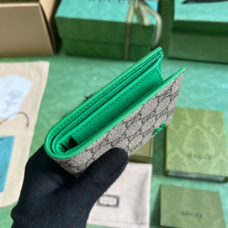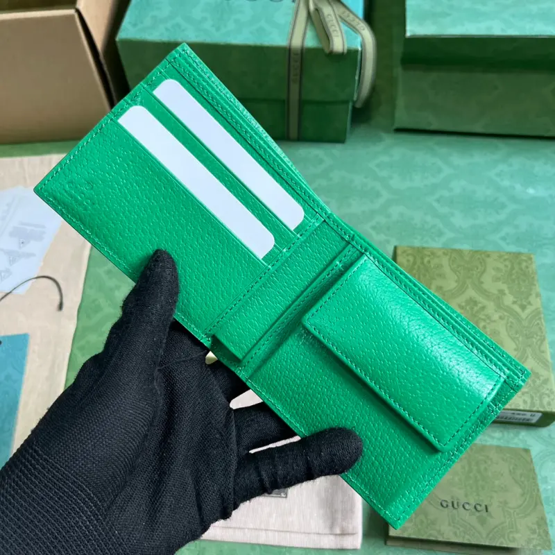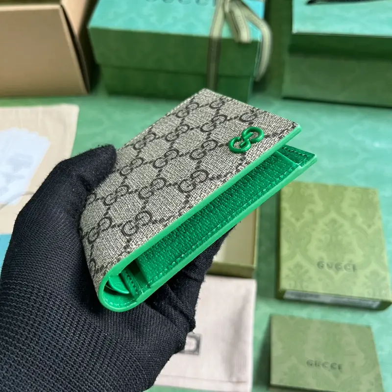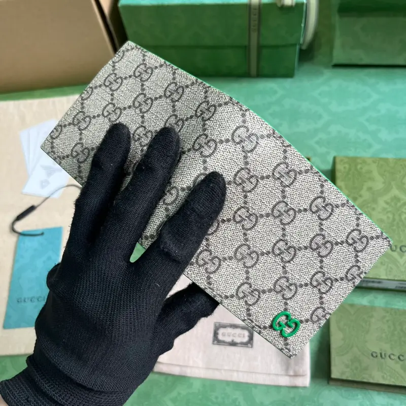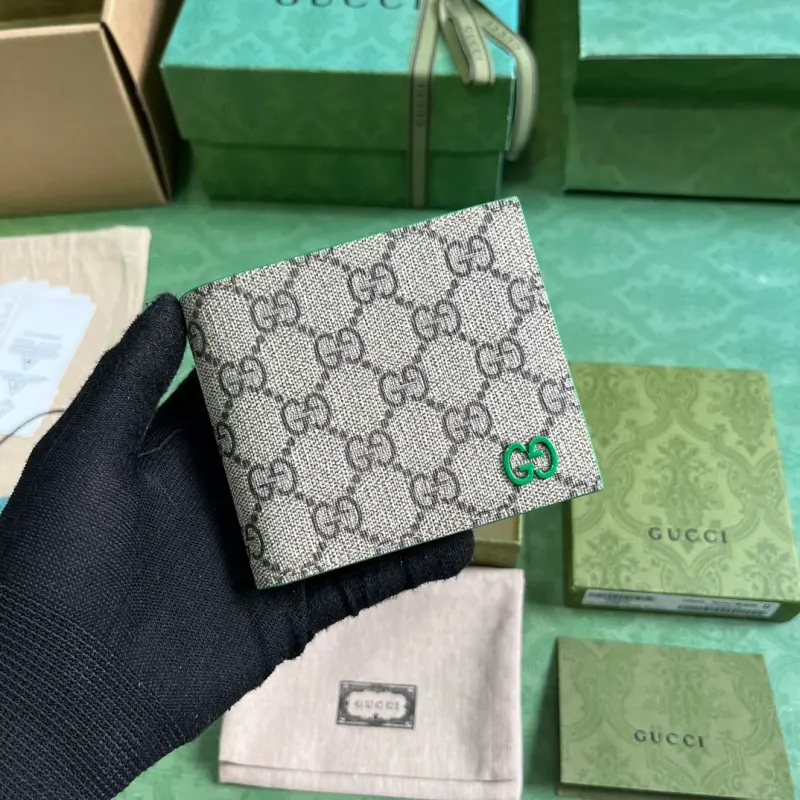 Wallet with GG details (comes with the original green box). Gbag’s small leather accessories push the boundaries of design, constantly reinterpreting classic pieces in unique ways. This men’s wallet expertly combines classic GG Supreme canvas with green GG hardware, resulting in a sophisticated, modern accessory. Made of beige and ebony GG Supreme canvas with green leather trim, brass hardware, and a green ceramic-effect finish, it features a moir?? fabric lining with GG details. Interior: card compartment, coin pouch, and bill compartment. Model No. 768244. Dimensions closed: 11 (W) x 9 (H) cm. Dimensions open: 21 (W) x 9 (H) cm. Color: Green/PVC.
