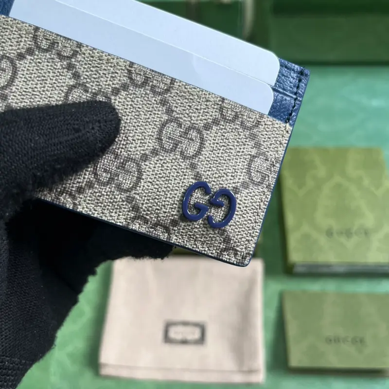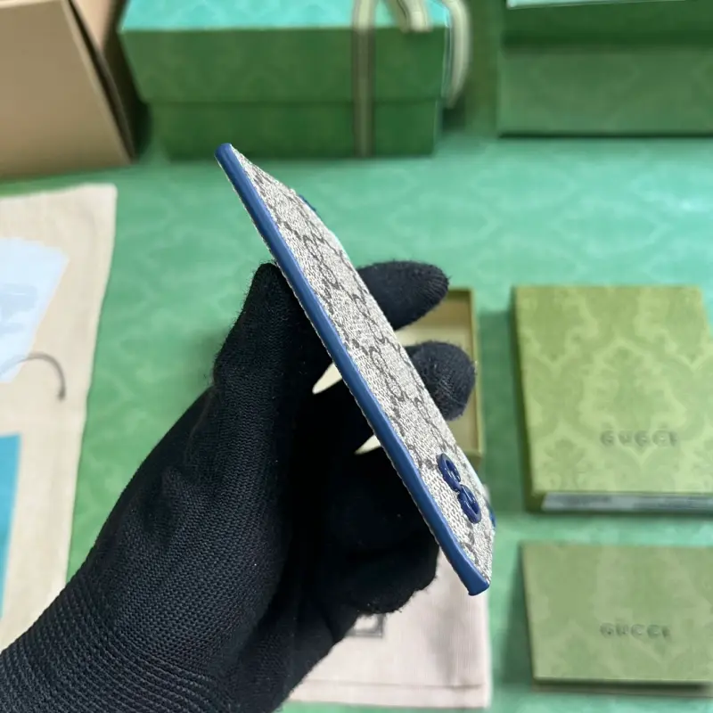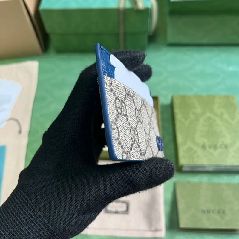 Comes with a complete set of original green box packaging. This card holder features GG details. Crafted from beige and ebony GG Supreme canvas, this card holder exudes elegance with the brand’s signature details. Small blue GG hardware adds a touch of color to the design. This piece features four card slots, adding a touch of glamour to the look. Made of beige and ebony GG Supreme canvas with blue leather trim, brass hardware, a blue ceramic-effect finish, and a moir?? fabric lining. It features GG details and four card slots. Model No. 768248. Dimensions: 11cm (W) x 7cm (H). Color: Blue/PVC.