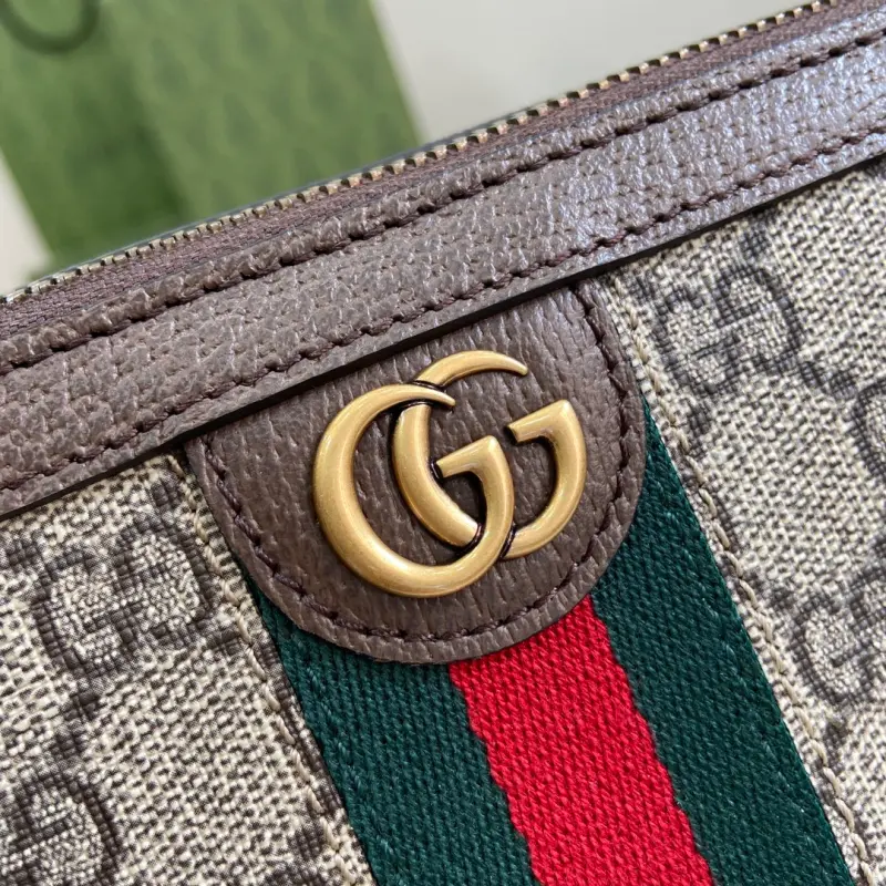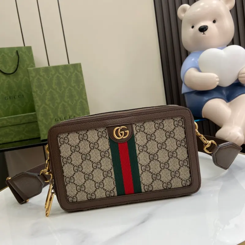 [Includes full original green box packaging] Ophidia GG mini handbag. The Ophidia collection blends Gbag’s heritage with contemporary design, showcasing a striking new creation. The collection incorporates iconic details, GG canvas and Double G hardware, reimagined in creative shapes and sizes for the Pre-Fall collection. This mini handbag is crafted from gray and black Supreme canvas, accented with palladium-tone hardware. It features gray and black GG Supreme canvas with gray leather trim, palladium-tone hardware, a Double G moir?? fabric and cotton and linen lining, and a detachable canvas shoulder strap with a zipper closure. Model No. 771174. Dimensions: 23cm (width) x 14.5cm (height) x 6cm (depth). Color: Brown/original PVC leather.