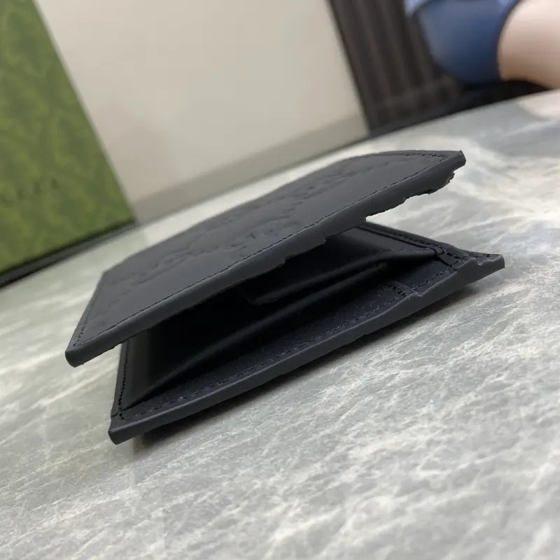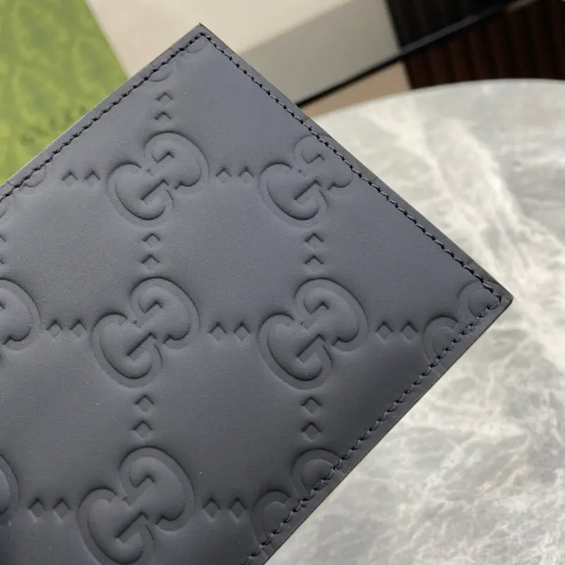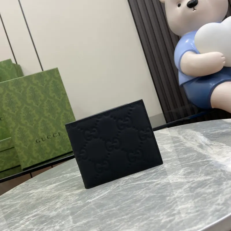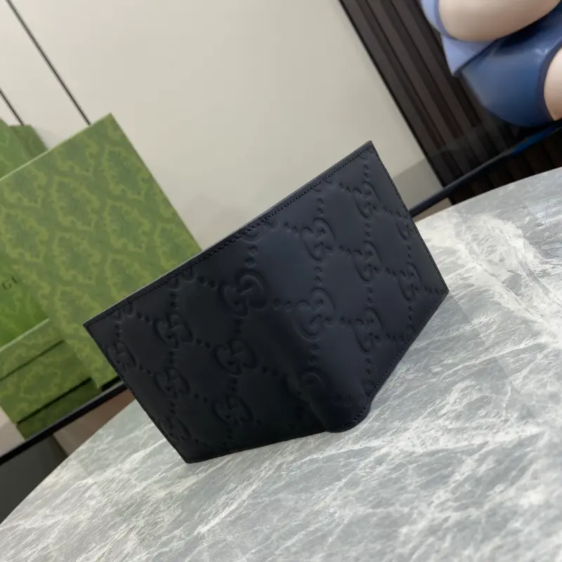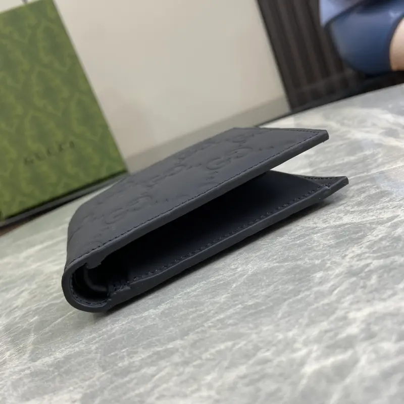 [Includes full original green box packaging] GG rubber-effect bifold wallet. A series of men’s wallets crafted from black rubber-effect leather debuts, injecting a fresh, modern aesthetic into everyday accessories. Introduced in the Cruise 2024 collection, this essential piece features eight card slots and two bill compartments, adding a modern touch. Made of black GG rubber-effect leather with a moir?? fabric lining. Model No. 771311. Dimensions (open): 9 cm (length) x 21 cm (width). Dimensions (closed): 9 cm (length) x 11 cm (width). Color: Black/G embossed leather.