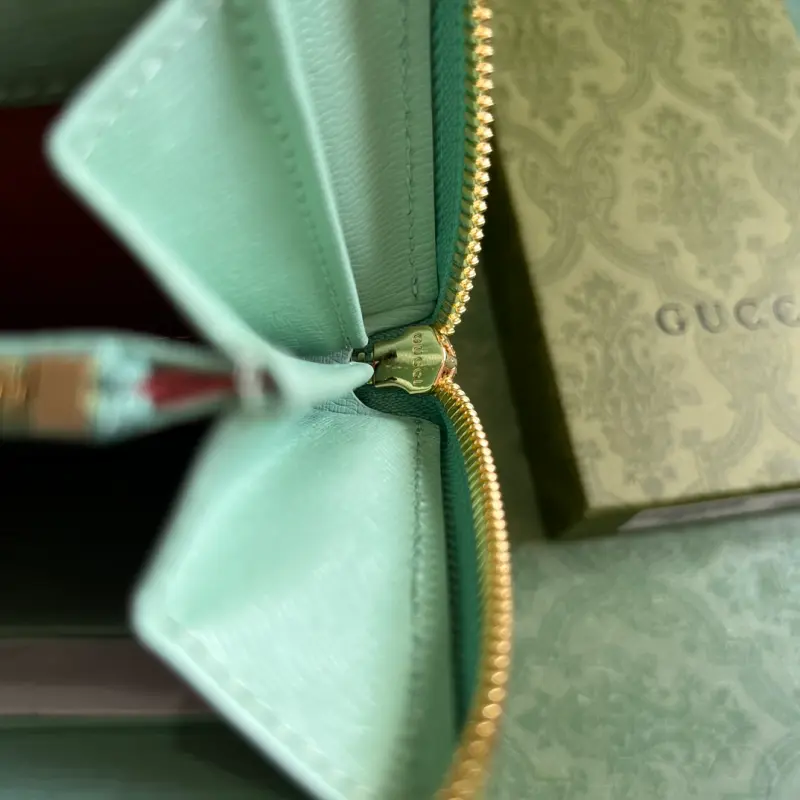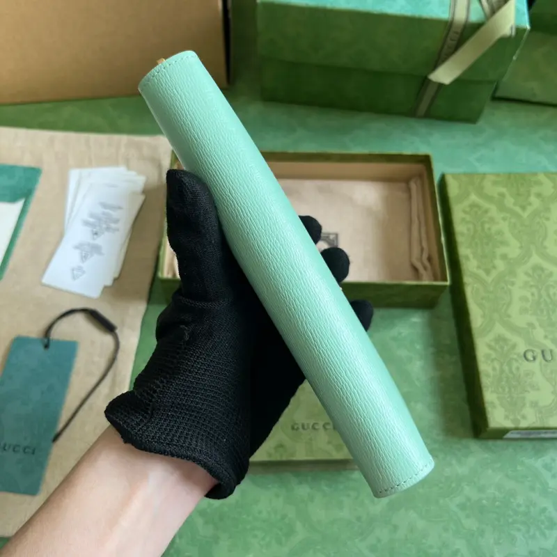 This long wallet features a handwritten Gbag logo. Exploring self-expression with limitless possibilities is a hallmark of the brand’s design. This wallet is expertly crafted from light green leather and embellished with gold-tone hardware featuring the handwritten Gbag logo, adding a touch of signature charm. Made of light green leather, with gold-tone hardware, taffeta lining, and handwritten Gbag logo details. Model No. 772642. Dimensions: 20cm (length) x 12.5cm (width) x 4cm (depth). Color: Light Green/Original Leather.