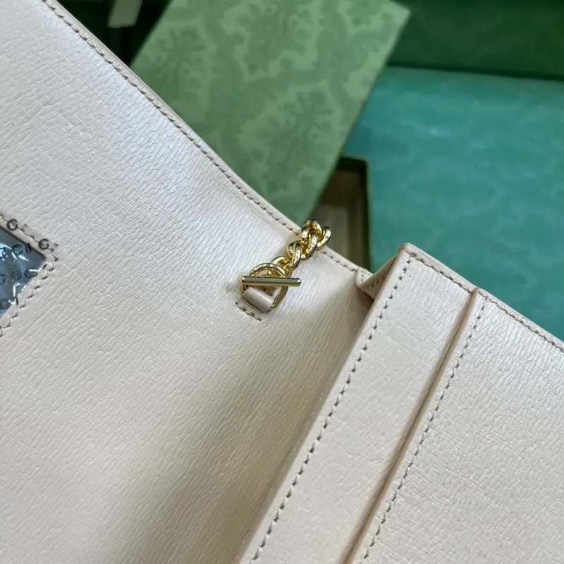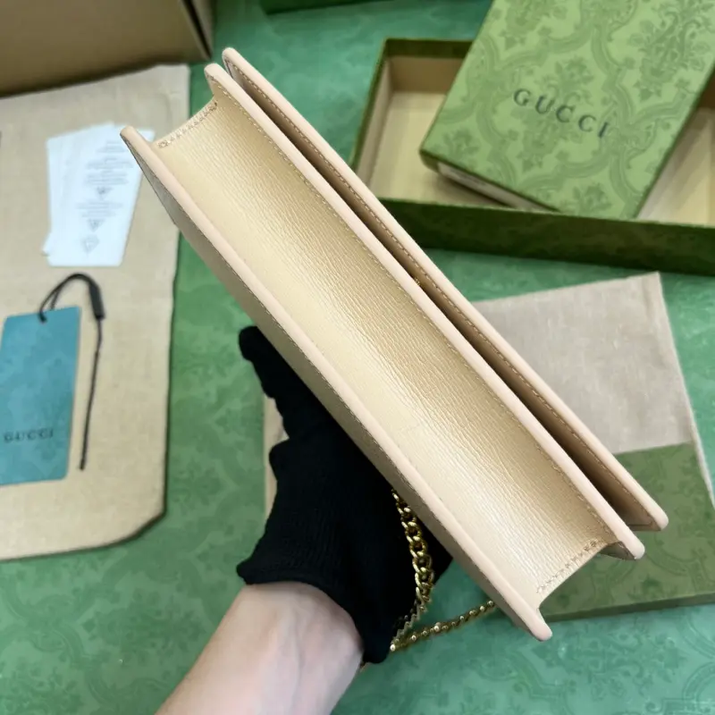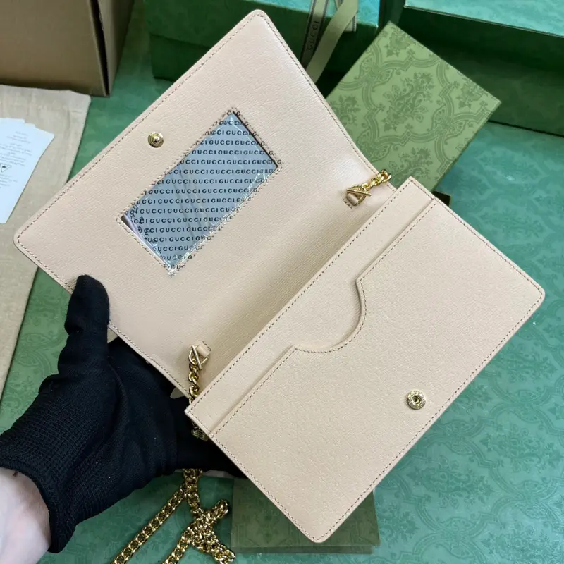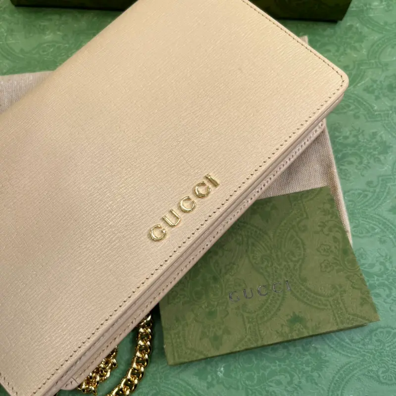 This chain wallet features a handwritten Gbag logo. The small leather accessory collection seamlessly blends modern fashion elements, creating timeless pieces that are timeless and reminiscent of classics, bringing a fresh touch to formal leather pieces. This chain wallet is expertly crafted from cream-beige leather and subtly detailed with a gold-tone handwritten Gbag logo. Features cream-beige leather, gold-tone hardware, a taffeta lining, and a handwritten Gbag logo. The interior includes six card slots, a flat pocket, a gusseted zip pocket, and an open compartment. It also features a chain strap and snap closure. Model No. 772643. Dimensions: 12.5cm (length) x 20cm (width) x 4cm (depth). Color: Cream-beige/original leather.