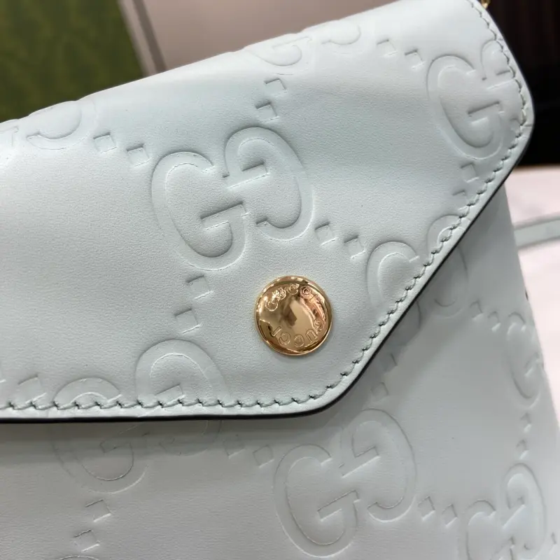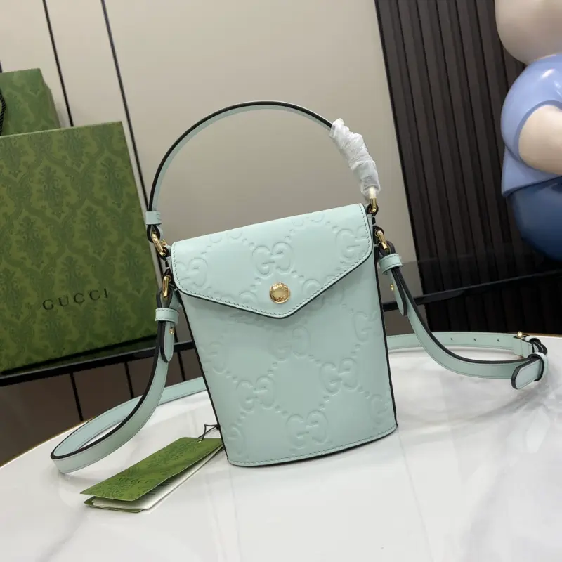 [Comes with a full set of original green box packaging] [New] GG mini bucket bag. The initials of the brand’s founder, Mr. Gbago Gbag, add color to leather accessories, integrating modern small leather goods with Gbag’s profound design heritage. The classic GG pattern with texture and luster injects a unique style into this elegant light green mini bucket bag. Light green GG leather, cotton and linen blend and moir?? fabric lining, top handle (8 cm high), adjustable shoulder strap (50 cm high), magnetic buckle closure. Model: 772795. Dimensions: 15.5 (length) x 12.5 (width) x 3 cm (thickness) Color: light green/embossed original leather. Made in Italy