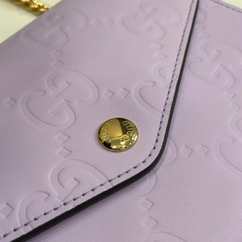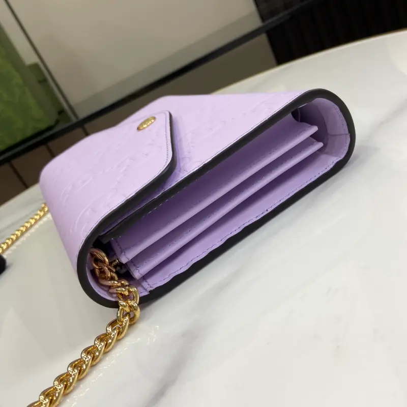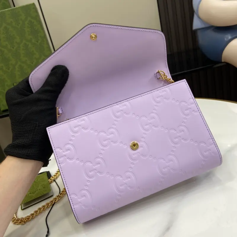 [Comes with a full set of original green box packaging] [New] GG leather chain wallet. The brand’s iconic pattern has been transformed into a symbolic element that is rich in variation yet classic, adding color to the new series. The iconic GG leather gives this chain wallet a unique charm. Black GG leather, gold-tone metal hardware, moir?? fabric lining, interior: zipper pocket, card compartment, banknote compartment and independent compartment, chain shoulder strap (60 cm high) snap closure. Model: 781555. Dimensions: 20 (width) x 13 (height) x 6 cm (depth) Color: Light purple/embossed G original leather. Weight: approximately 0.41 kg Made in Italy