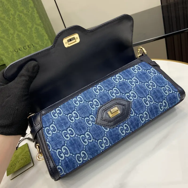 [Includes full original green box packaging] [New Arrival] Gbag Luce Small Shoulder Bag. This piece from the Gbag Lido collection is inspired by the summer vibes and beach clubs of the Italian coast. The Gbag Luce bag exudes a playful and playful feel. “Luce” means “light” in Italian. This shoulder bag is crafted from blue GG denim with blue leather trim and light-gold hardware. The adjustable and detachable red and blue striped web strap fastens to the accessory loops through leather loops on both sides. The bag is crafted from blue GG denim with blue leather trim, light-gold hardware, and a cotton and linen blend lining. The interior features a zippered pocket with a Gbag emblem zipper pull, a detachable red and blue web shoulder strap (26 cm drop), and a twist-lock closure. Weight: Approximately 0.55 kg. Model No. 786027. Dimensions: 27.5 cm (width) x 12.5 cm (height) x 6.5 cm (depth). Color: Blue/Denim Canvas. Italian creation