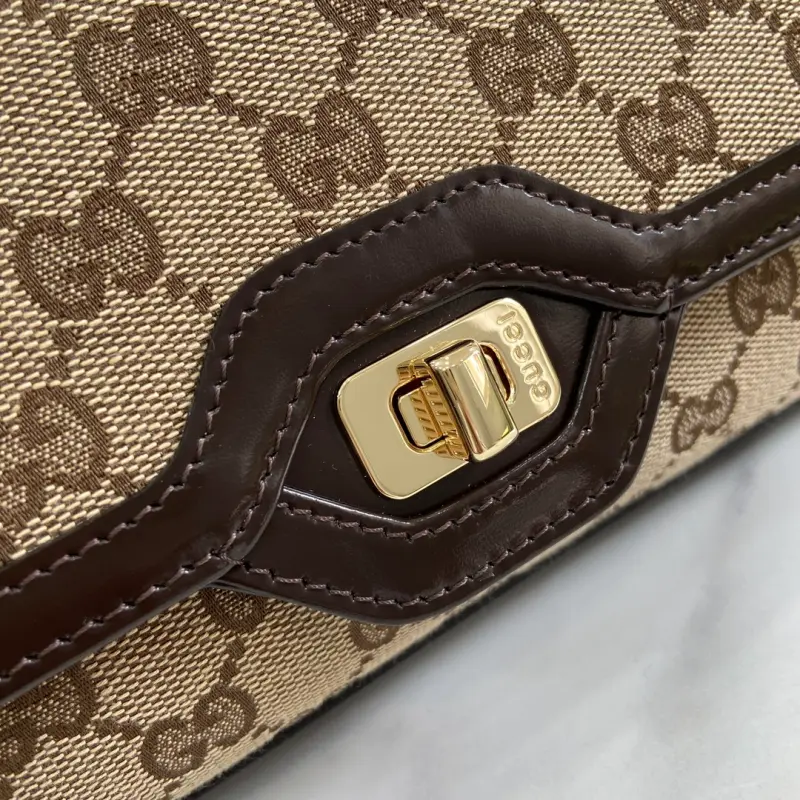 [Includes full original green box packaging] [New Arrival] Gbag Luce small shoulder bag. The Gbag Luce collection exudes a playful and playful feel. “Luce” means “light” in Italian. This small shoulder bag is crafted from classic GG canvas. Dark brown leather trim and light gold-toned hardware enhance the beige and ebony pattern. An adjustable and detachable red and green striped webbing strap passes through leather loops on each side and fastens to the accessory loop, adding functionality and structure to this bag. Beige and ebony classic GG canvas features a loom-woven cotton base, brown leather trim, light gold-toned hardware, and a cotton and linen blend lining. Interior: one zipper pocket with a Gbag emblem zipper pull and a detachable webbing shoulder strap (26 cm drop) with a turnlock. Weight: Approximately 0.55 kg. Model No. 786027. Dimensions: 12.5 (L) x 27.5 (W) x 6.5 cm (D) Color: Brown/Canvas Made in Italy