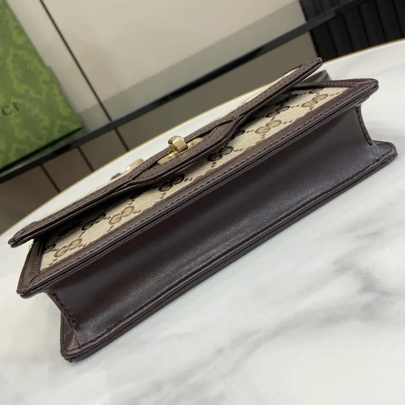 [Includes full original green box packaging] [New Arrival] Gbag Luce Mini Shoulder Bag. The Gbag Luce collection exudes a playful and playful feel. “Luce” means “light” in Italian. Original GG canvas imbues this elegant mini shoulder bag with its design essence. Brown leather trim and light gold-tone hardware complement the beige and ebony pattern. An adjustable brown leather shoulder strap adds versatility. Features beige and ebony Classic GG canvas, brown leather, light gold-tone hardware, a cotton and linen blend lining, a zipper pull with the Gbag emblem, and an interior with a flat pocket, an adjustable shoulder strap (20 cm drop), and a twist-lock closure. Weight: Approximately 0.25 kg. Model No. 790038. Dimensions: 20 cm (width) x 10 cm (height) x 4 cm (depth). Color: Brown/Canvas.