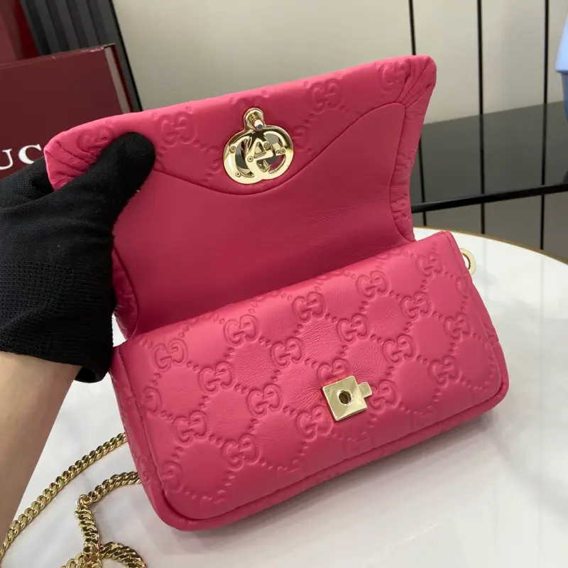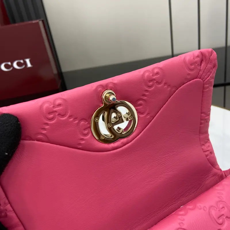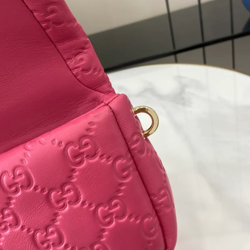 Comes with a complete set of original green box packaging. The GG Milano mini shoulder bag, designed by Creative Director Sabato De Sarno, debuted on the Fall/Winter 2024 runway during Milan Fashion Week, paying tribute to the city that inspired the brand. This handbag features a new Double G design crafted from soft, silky, fluffy leather. A chain strap allows for versatile styling, allowing it to be easily worn over the shoulder or across the body. Model No. 806017 Dimensions: 21″ (length) x 12.5″ (width) x 4.6″ (depth). Color: Pink embossed/original leather.