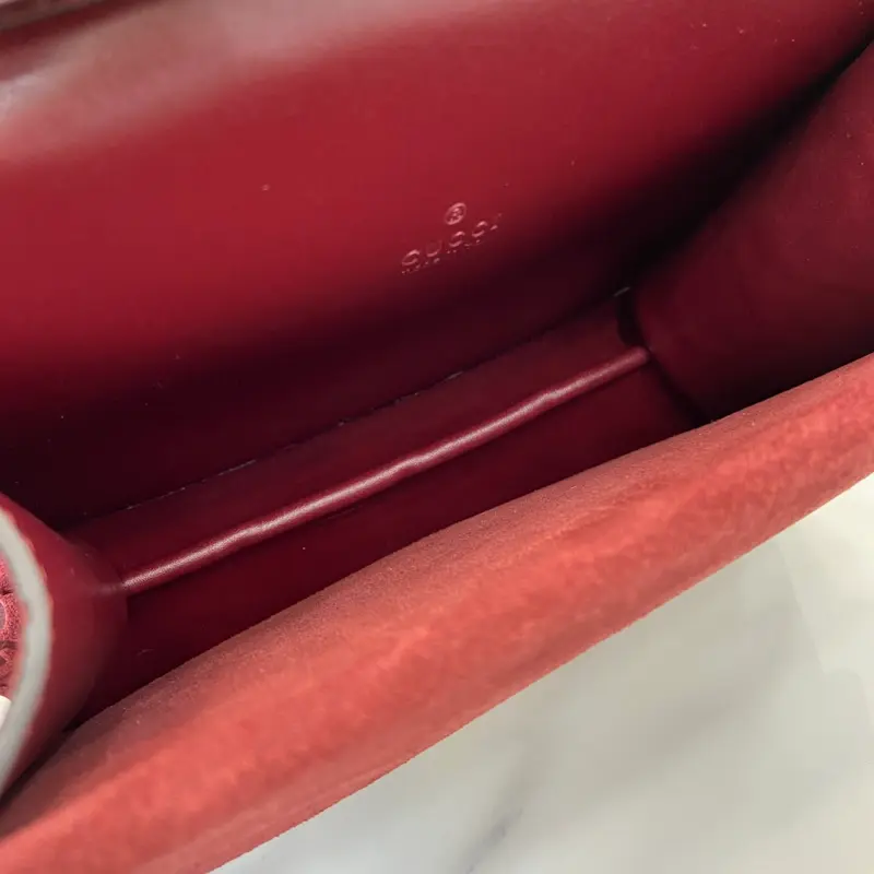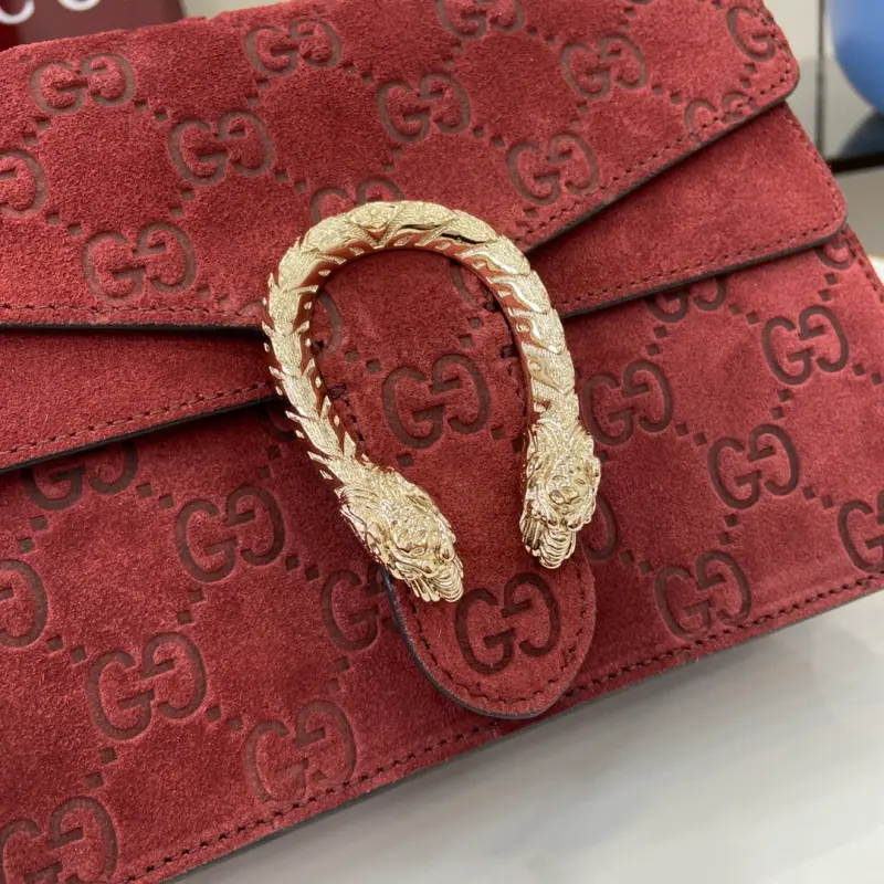 [Comes with a full set of original green box packaging] [New] Gbag Creative Director Sabato de Sarno recreates the classic Dionysus series mini handbag. This handbag is crafted from brown GG suede material, with a tiger head lock and flap design, and a detachable leather shoulder strap for crossbody carry. Red GG suede material, light gold-tone hardware, red leather lining, interior: 2 main compartments and 1 flap open pocket, handle height: 8 cm, detachable leather shoulder strap (height 53-59 cm; length 108-119.5 cm), double tiger head lock model: 813400. Mini size: 22 cm (width) x 16 cm (height) x 8 cm (depth) Color: Red embossed/original leather, made in Italy