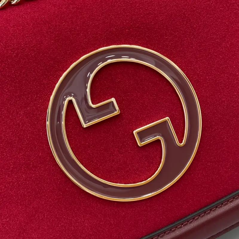 [Includes full original green box packaging] [New] Gbag Blondie Small Shoulder Bag. Embellished with the iconic Gbag logo, which debuted in the early 1970s, this new bag from the Gbag Blondie collection cleverly blends heritage charm with contemporary style, perfectly embodying the brand’s timeless design with a modern twist. Crafted from Gbag Anchora leather, this small shoulder bag features an enameled roundel logo and a gold-tone chain strap. Model No. 815715. Dimensions: 26 (length) x 16 (width) x 8 (depth). Color: Red Brushed Maroon Leather/Original Leather.