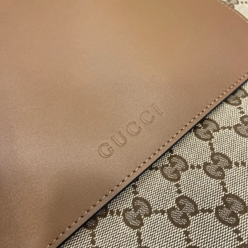 [Includes a complete set of original green gift bags] [New] Gbag Body Double Lock Medium Shoulder Bag. The Gbag Body Double Lock handbag collection is inspired by a collection from the 1950s. This medium shoulder bag embodies the essence of classic mid-20th-century styles, crafted from Original GG canvas for a draped, fluid silhouette. Model: 815924. Dimensions: 49cm (length) x 46cm (height) x 4cm (depth). Color: Almond Brown Leather/Original Leather. Made in Italy.