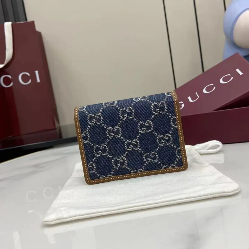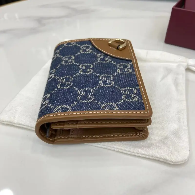 ??With a full set of original counter packaging????New Product??The new GG Emblem series reinterprets the brand’s timeless elegance and exquisite craftsmanship. This blue and ivory mini wallet is crafted with GG denim. Carefully arranged with multiple compartments, cleverly integrated with practical snap closures. Blue and ivory GG denim fabric, brown leather piping, equipped with a small D-ring taffeta lining, interior: 5 card compartments, 1 open pocket, 1 zipper pocket and 1 banknote compartment, snap closure model: 820692. Dimensions when closed: 11 cm (width) x 8.5 cm (height) x 3 cm (depth); Dimensions when open: 11 cm (width) x 17.5 cm (height) Weight: approximately 130 grams Color: blue denim brown/original leather. Made in Italy