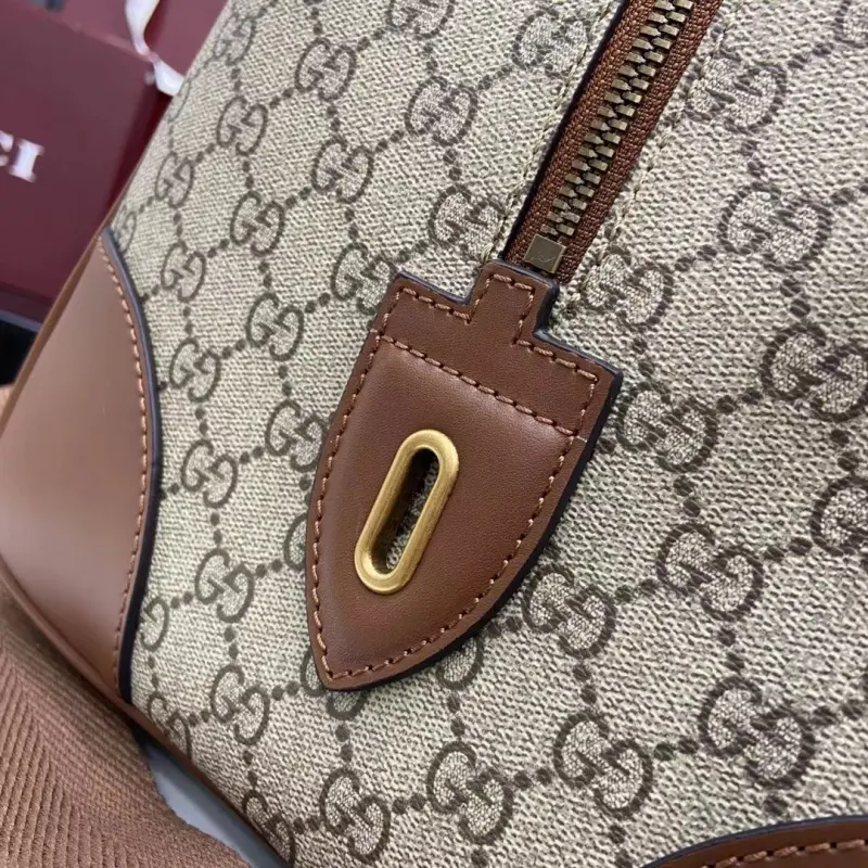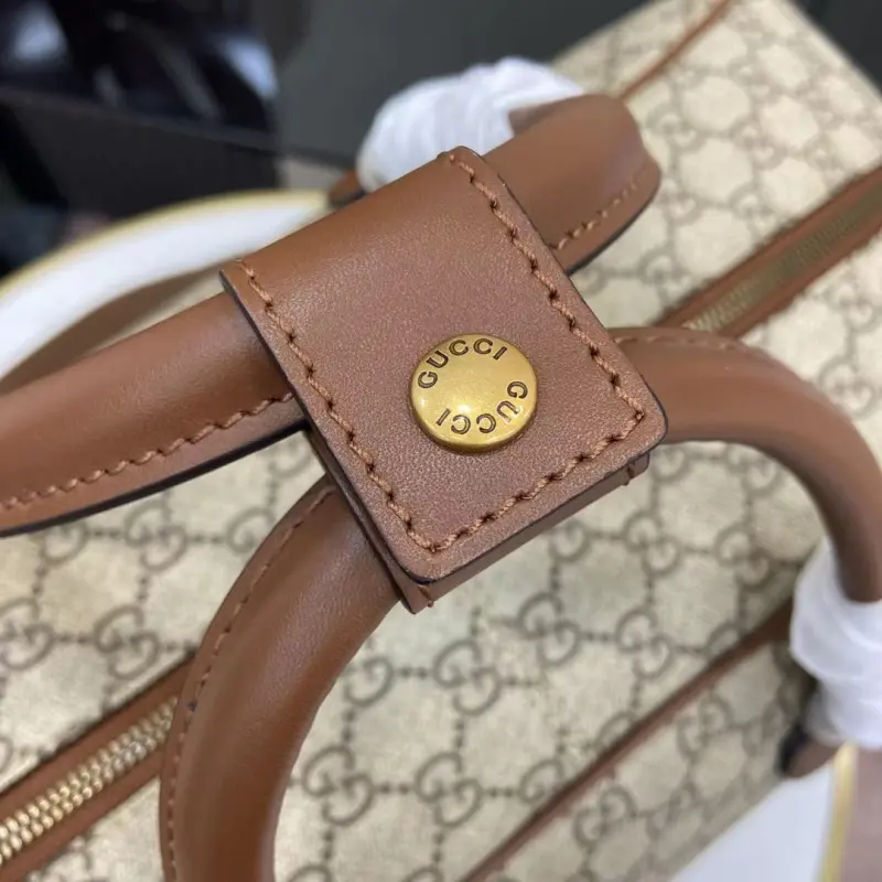 [Comes with a full set of original gift bag invoice] [New Product] The new GG Emblem series reinterprets the brand’s timeless elegance and exquisite craftsmanship. This travel bag is crafted with new beige and dark brown GG letter pattern coated fabric, with a detachable canvas shoulder strap. Beige and dark brown new GG letter pattern coated fabric Brown leather piping Cotton lining Lock and key chain Interior: 1 zipper pocket Handle: 12 cm (height) Detachable canvas shoulder strap (55 cm high); length can be adjusted between 90 cm and 143 cm Zipper closure model: 821148 Dimensions: 47 cm (width) x 31 cm (height) x 25 cm (depth) Weight: approximately 1.85 kg Color: brown glue pvc brown/original leather. Italian creation