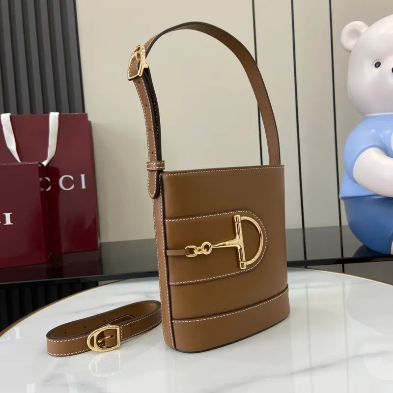 ??Comes with a full set of original counter packaging????New Product??In the 2025 Spring/Summer Collection, the Gbag 73 series draws inspiration from a classic bucket bag launched in the same year as the series’ name. This bag interprets the horsebit-shaped accessory with a modern aesthetic and can be worn cross-body, on the shoulder, or as a handbag. Brown smooth leather, gold-tone oversized half horsebit-shaped accessory, brown cotton and linen blend lining, interior: 1 zipper pocket, shoulder strap (19 cm high); comes with a detachable bag strap (50 cm high), magnetic buckle closure, model number: 833665. Dimensions: 18.5 cm (width) x 20 cm (height) x 8.5 cm (depth), color: brown full leather/original leather. Weight: approximately 0.5 kg, made in Italy