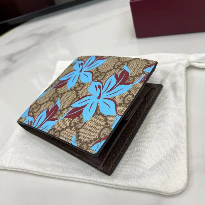 [Comes with full original factory packaging] [New Arrival] The iconic GG Supreme canvas makes a stunning appearance in the 2025 Early Fall Collection, reinterpreting the new floral print in blue tones. This beige and dark brown bifold wallet is embellished with a modern floral pattern and GG logo. Beige and dark brown GG Supreme canvas with an all-over blue floral print and moir?? fabric lining. Interior: 4 card compartments, 1 coin pocket. Model: 841146. Dimensions when closed: 11 cm (width) x 9 cm (height); dimensions when open: 21 cm (width) x 9 cm (height). Weight: Approximately 0.11 kg. Color: Brown gum print/original leather. Made in Italy