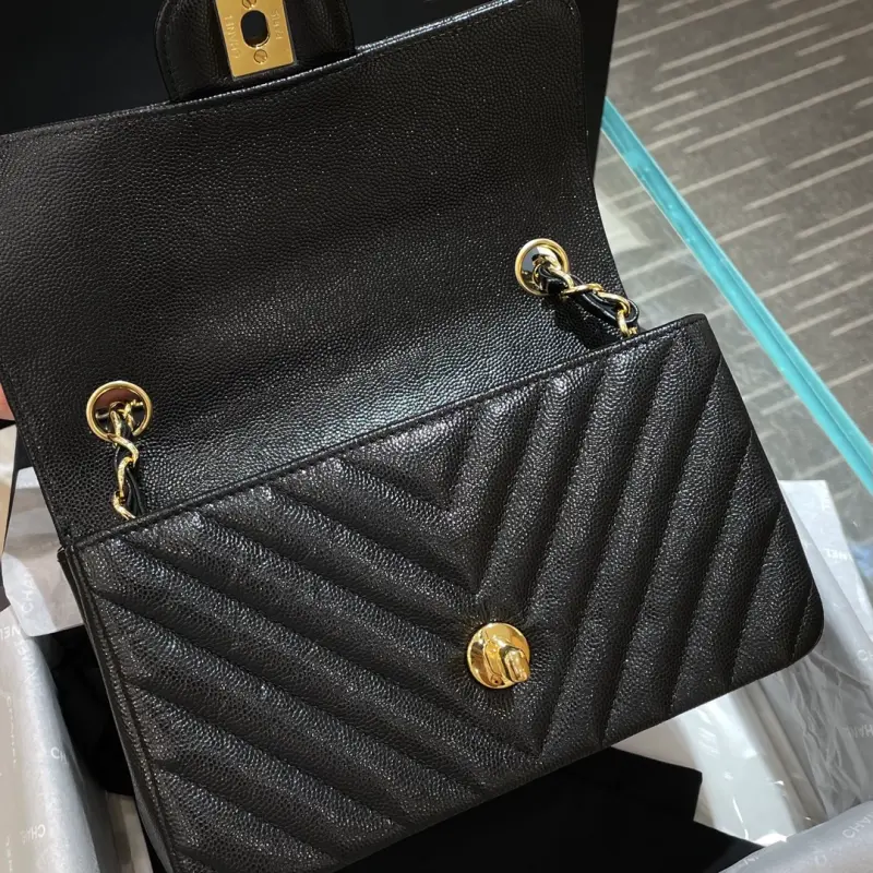 CF-Large Mini 20cm-Fine Spherical Caviar Leather-V-Grained Edge-Black Gold Buckle