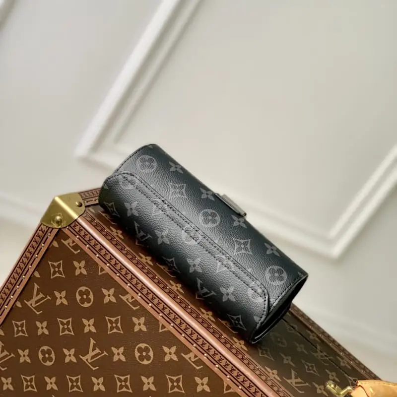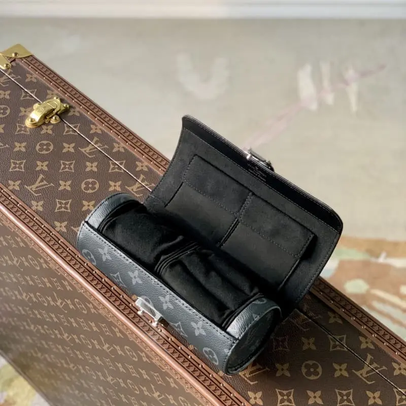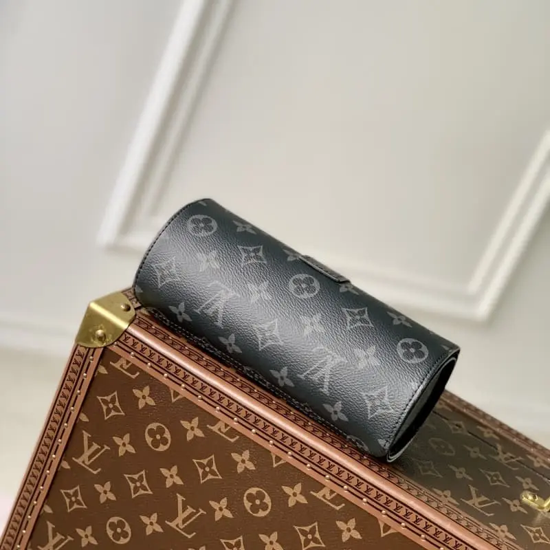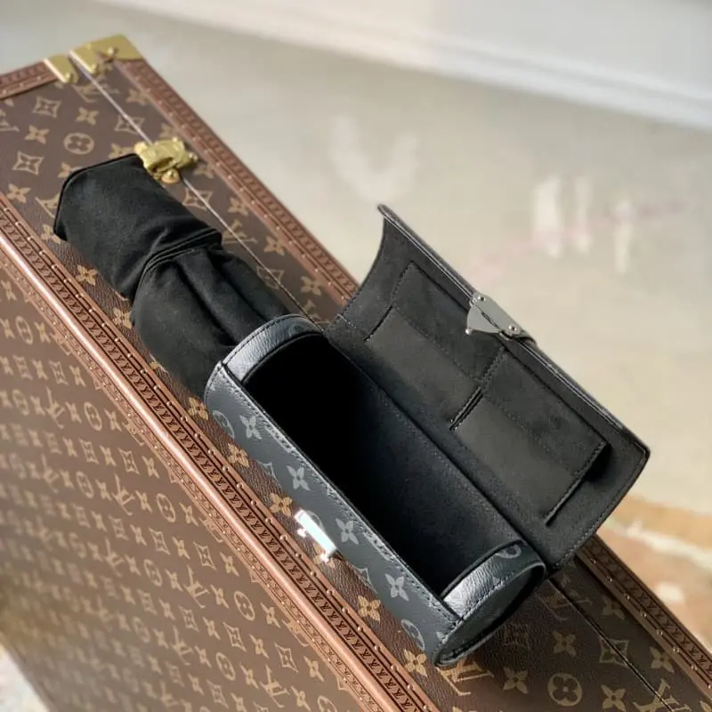 M10145 The “Etui Bijou” with leather trim on black floral Monogram canvas gives a sophisticated impression. It has a compact size and excellent storage capacity. There are 2 buttoned pockets and 2 cushions with slots on the inside to safely store necklaces, watches, rings, bracelets, and earrings. The gold S-lock clasp creates an elegant and feminine atmosphere. 19 x 8 x 8 cm