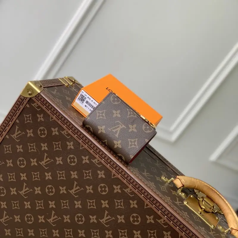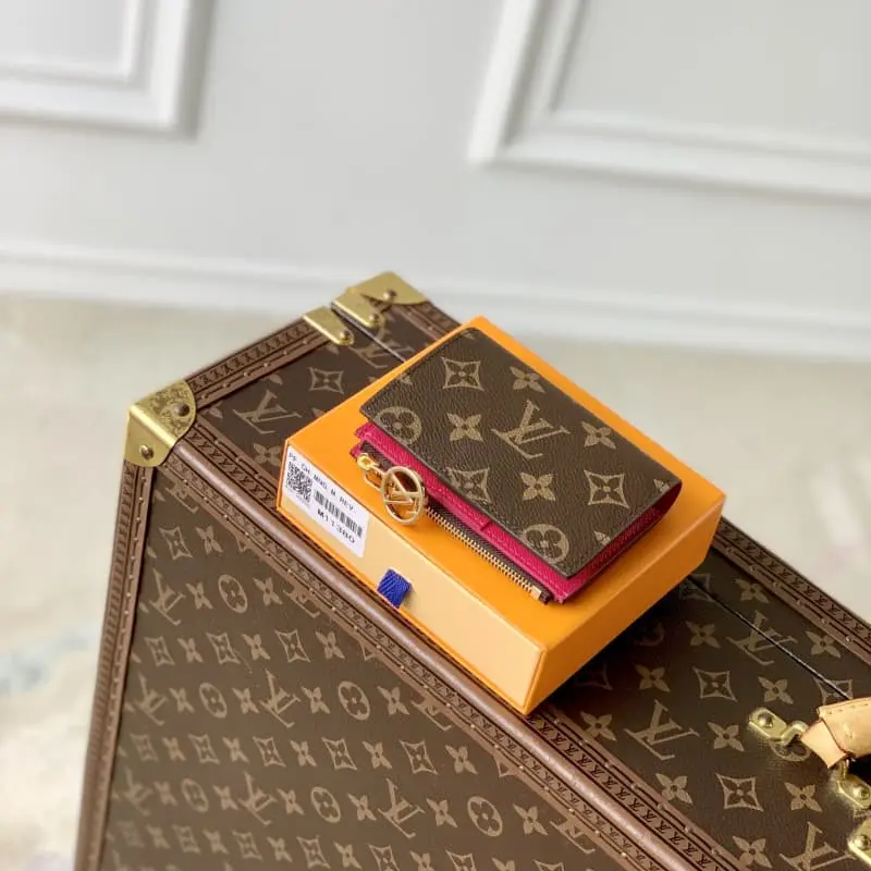 M11380 “Portefeuil Lisa” made of Monogram canvas with colorful leather lining. The compact wallet with a coin pocket with a pull handle LV ring is also attractive in size for small bags and clutches. There are bill compartments, 2 flat pockets and 4 card slots on the inside. Dimensions: 9??11.5??1.5