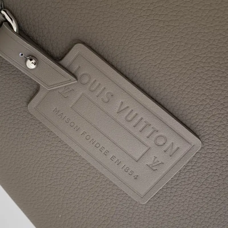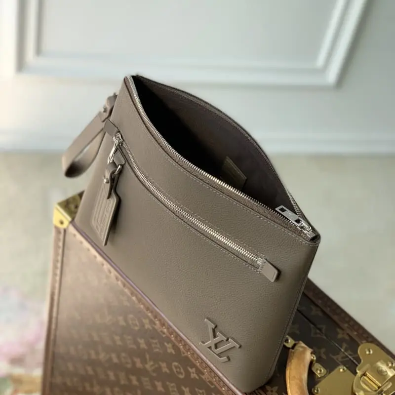 M11485 Brown Takeoff Pouch is made of LV Aerogram leather and features a front patch pocket zipper with eye-catching palladium-colored hardware. This lightweight organizer is large enough to hold a tablet for everyday use. The zippered main compartment has two business card slots and comes with a detachable wristlet that can be hung on the wrist or carried as a clutch. 30 x 22 x 5 cm (length x height x width)