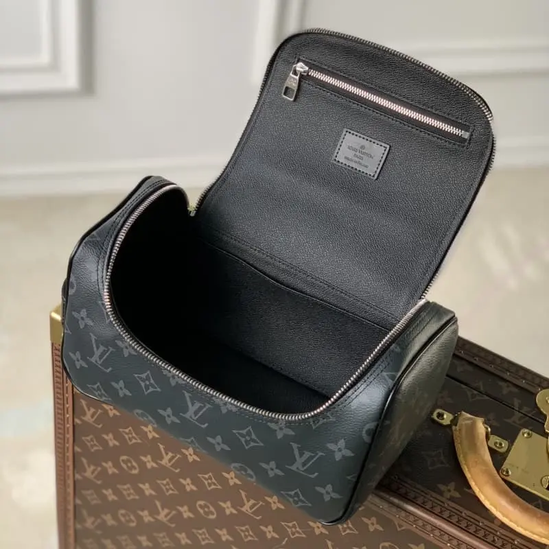M11510 Black Flower Toiletry Bag This toiletry bag is made of Damier Graphite canvas with a rugged feel. The practical elastic lining keeps bottles upright. Damier Graphite canvas Cotton lining Leather trim Silver-tone metal hardware, wide zipper closure, one zippered inner pocket Dimensions: 26 x 14 x 12 cm