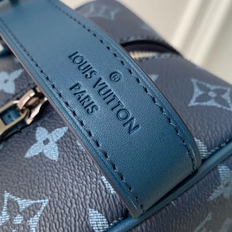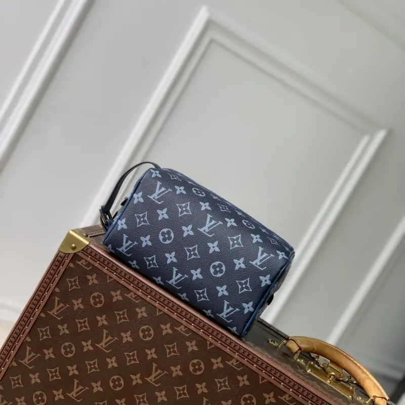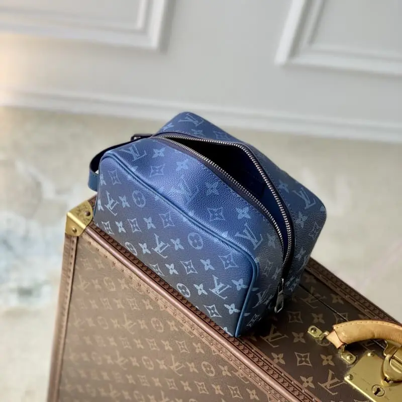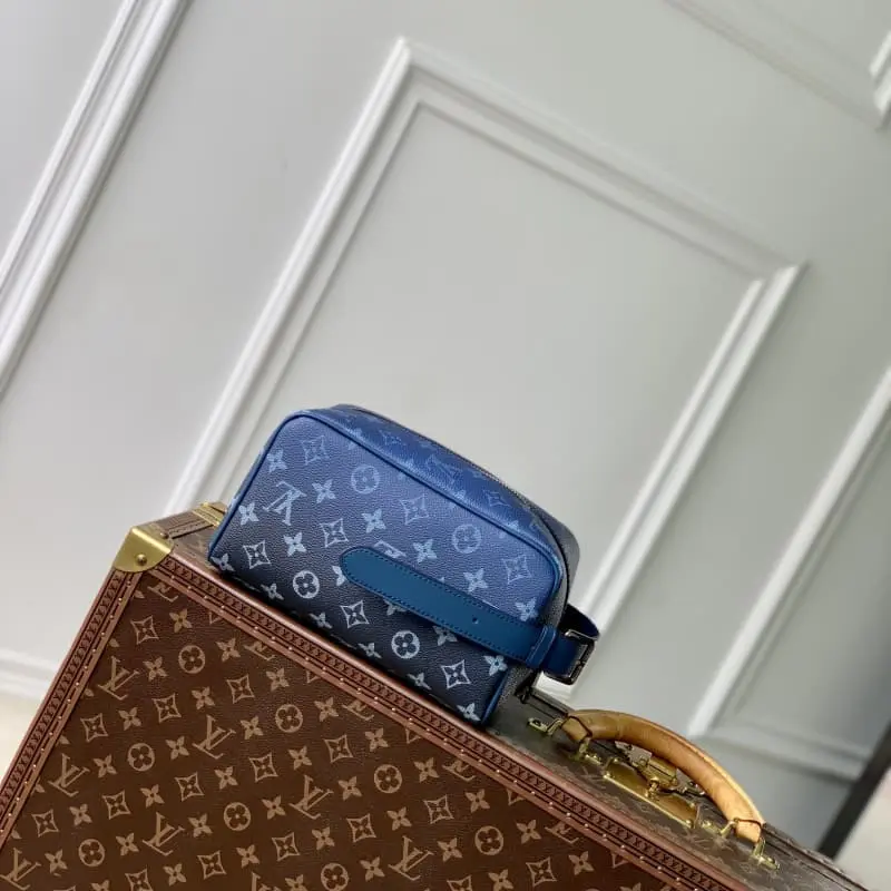 M11559 Blue This Locker Dopp Kit toiletry bag is elegantly made of Monogram Gradient coated canvas, which cleverly depicts the gradual disappearance of the Monogram pattern. The wide mouth design and washable fabric lining make it easy to store. The wide adjustable handle is convenient for carrying by hand or hanging on a hook. 23 x 13 x 12 cm (length x height x width)