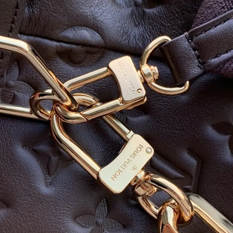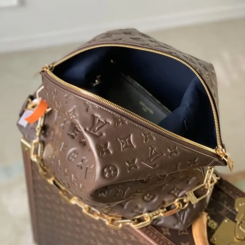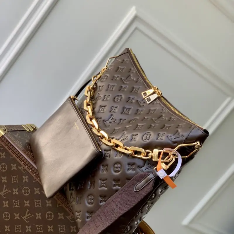 M12072 Coffee This new Hobo model complements the Coussin collection and strikes a balance between style and functionality. It showcases the collection’s signature design details, crafted from smooth padded leather and embellished with the brand’s monogram and features a signature thick chain with gold hardware. The large, detachable fabric strap offers a variety of wearing options. This versatile piece also includes a detachable zippered pocket that’s perfect for laptop storage. 38 x 33 x 10cm (length x height x width)