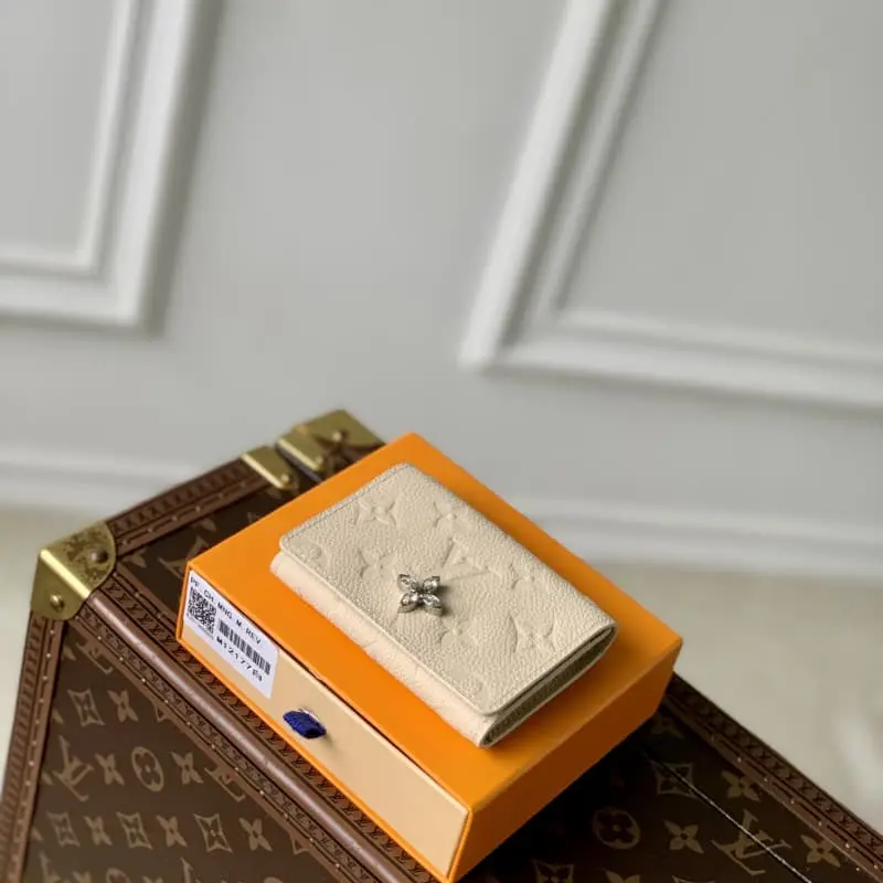 M12177 White LV Ski series business card holder is the iconic Monogram Empreinte leather dyed with lustrous winter snow tones and then illuminated by imitation crystals. Monogram flowers can easily store business cards and name cards. Size: 8 x 1 x 10.5 cm