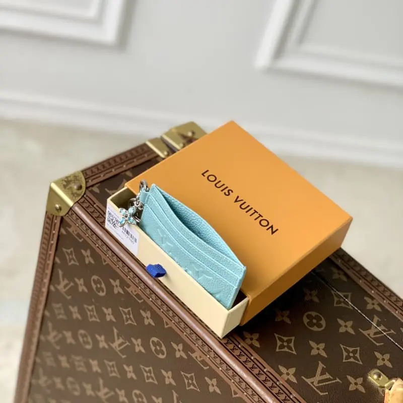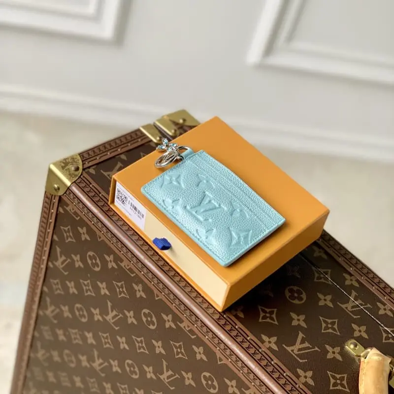 M12180 Blue This LV Charms card holder is ideal for the holiday season with its glittering effect. From the LV Ski collection, this iconic Monogram Empreinte leather model features the LV Circle and Monogram flower charms set with crystals. This elegant accessory has two outer grooves on each side and a wider compartment in the middle. Dimensions: 10.2-7.3-0.3 cm