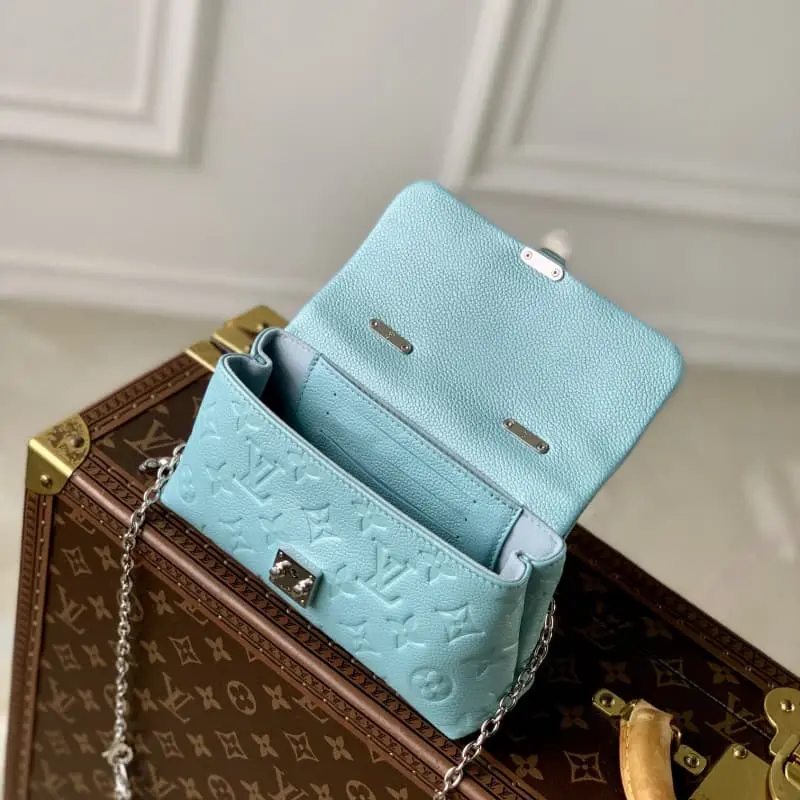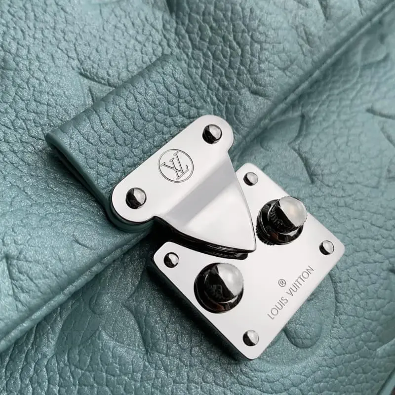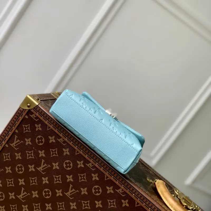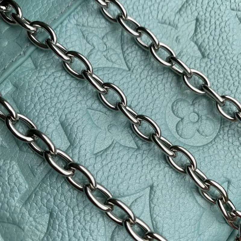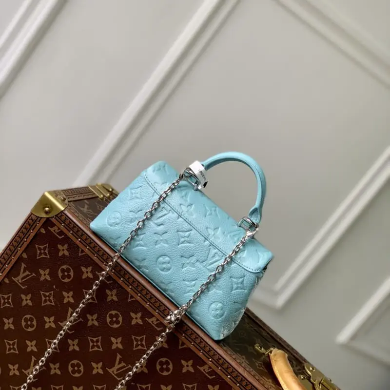 The M12211 Light Blue Nano Madeleine handbag joins the LV Ski series with a sparkling style. It is made of Monogram Empreinte leather with an elegant new color and paired with the classic S-lock clasp. The metal chain embellished with imitation crystals can be easily converted to crossbody, shoulder or hand-carrying. 12.5 x 6 x 21 cm (height x width x length)