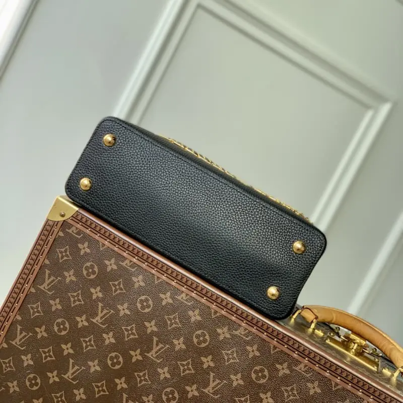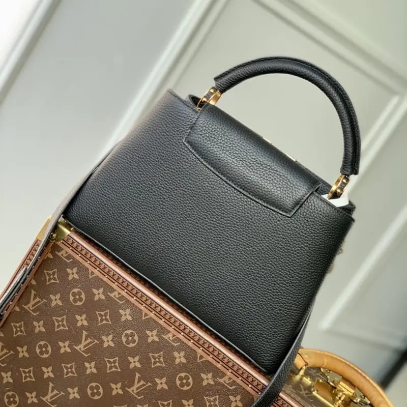M12345 Medium Black This Capucines Medium Handbag from the Trilogy Collection conveys elegance with Taurillon cowhide leather and dazzling metal parts. Gorgeous chain embellished with mini padlock and enamel Monogram flower Flap that can be opened externally or internally Multiple pockets Sophisticated design allows for a variety of carrying experiences. 20??11??31 cm (height x width x length)