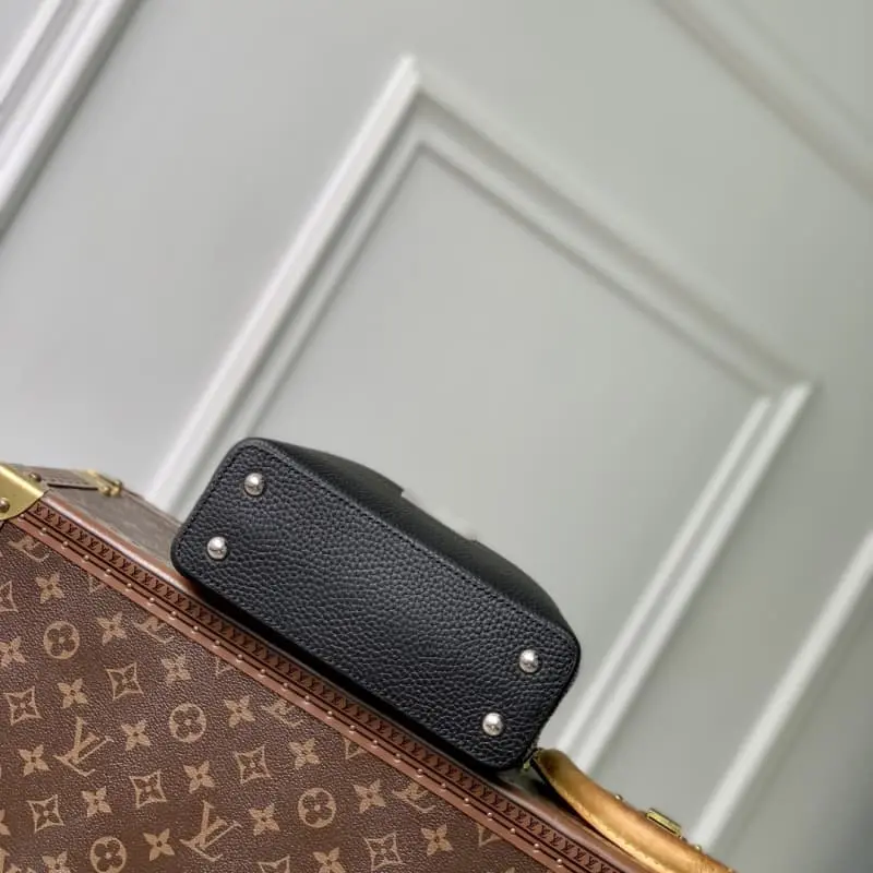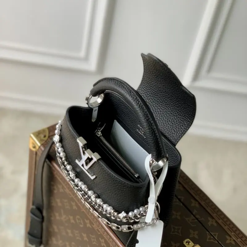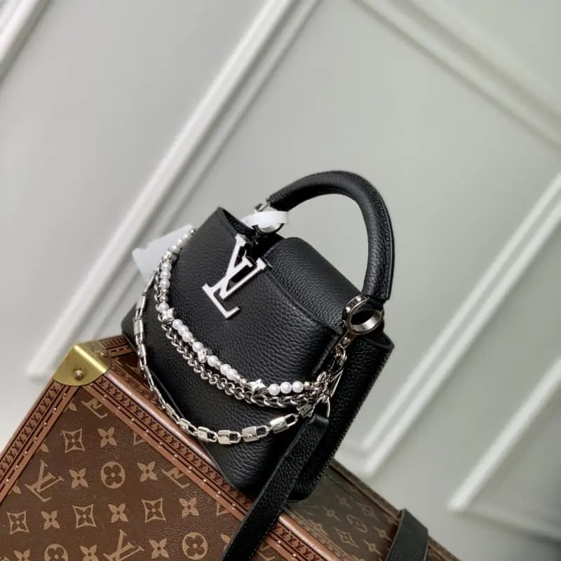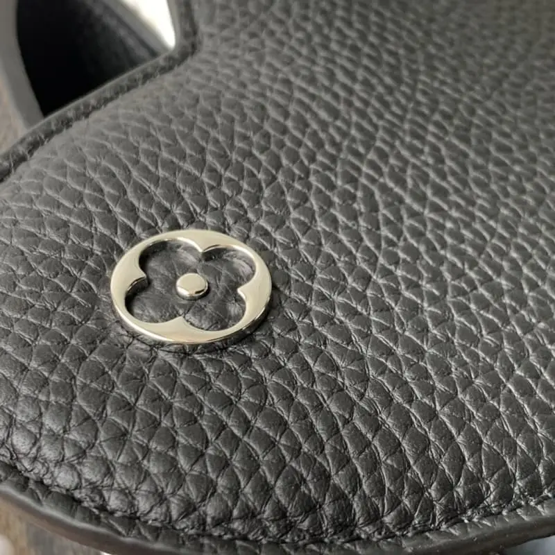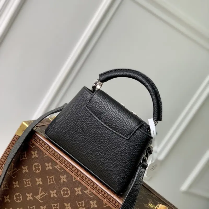 M12345 Mini Black Silver This Capucines mini handbag from the Trilogy series conveys elegance with Taurillon cowhide leather and dazzling metal parts. Gorgeous chain embellished with mini padlock and enamel Monogram flower Flap that can be opened externally or internally Multiple pockets Exquisite design allows for a variety of carrying experiences. 13.6??8??21 cm (height x width x length)