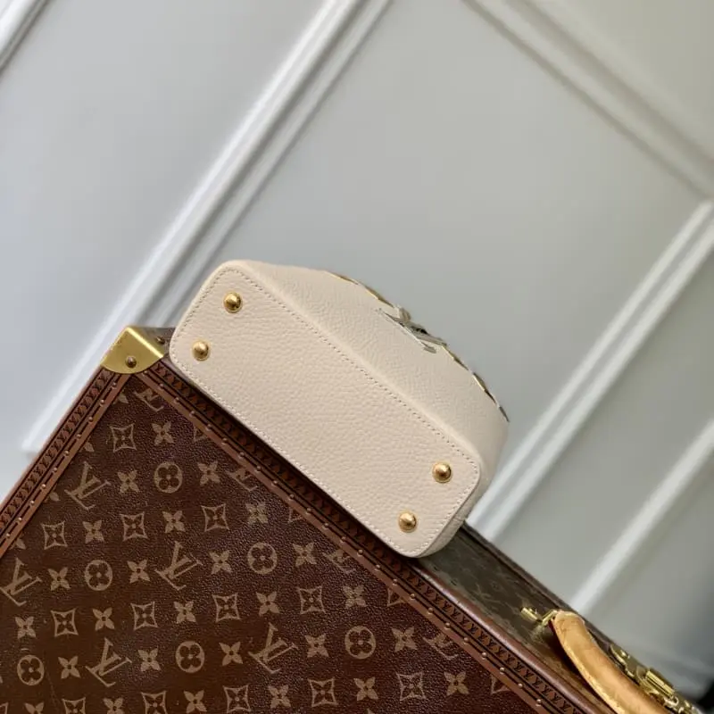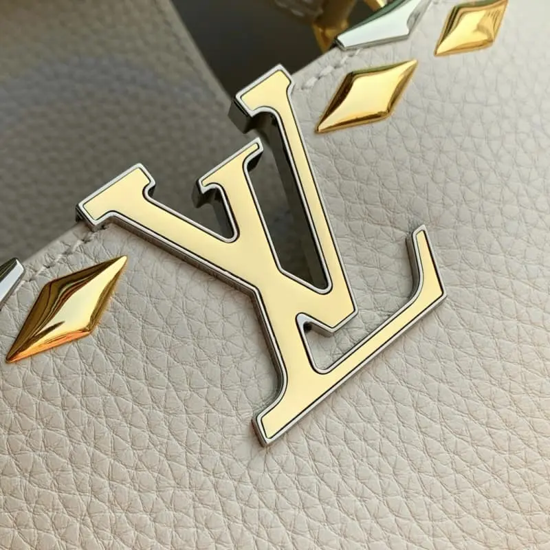 M12751 Apricot Mini Capucines Mini Handbag is made of Taurillon cowhide leather. The Malletage upper edge is shaped with shiny diamond-shaped metal elements, highlighting the novel design of the season. The flap provides two styles of external or internal storage. The ample compartments inside can accommodate what you need on the go. 13.6 x 8 x 21 cm (height x width x length)