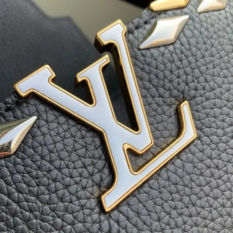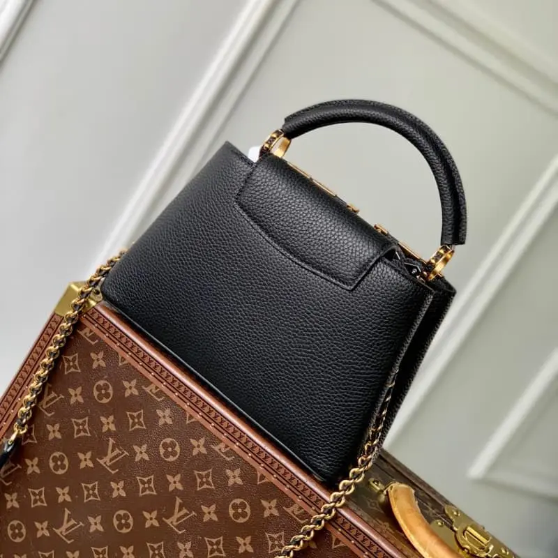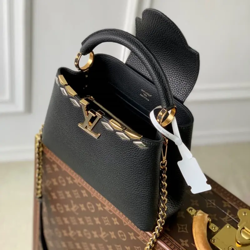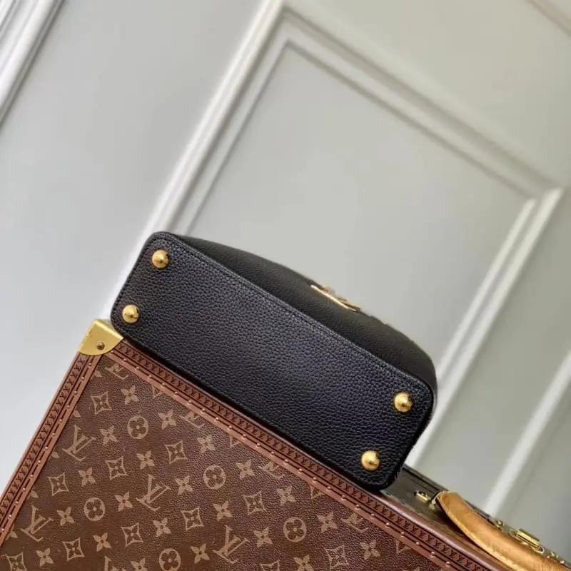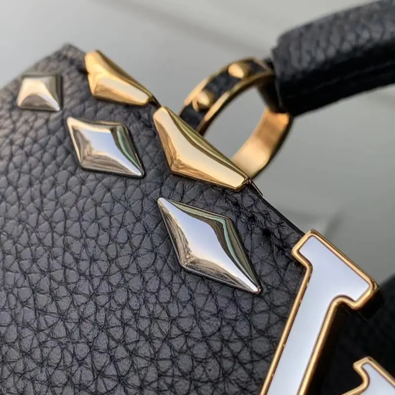 M12751 Small Black Capucines BB bag in Taurillon leather with mixed metal diamond-shaped Malletage elements on the top edge for a gorgeous interpretation of the classic design. The flap can be opened or closed. The neat interior has multiple pockets. The adjustable shoulder strap can be worn crossbody in addition to the top handle. 17.3 x 9 x 27 cm