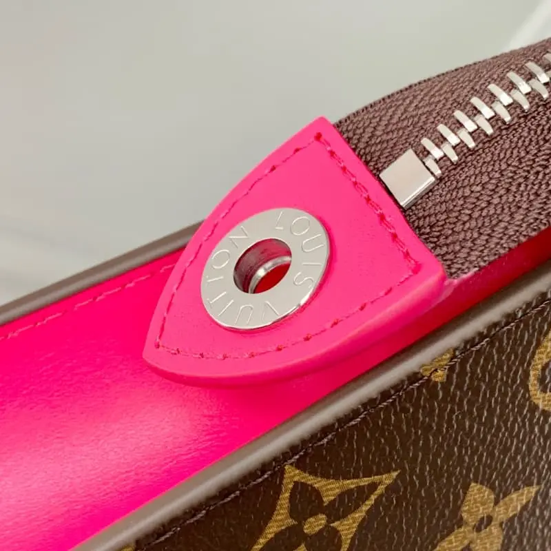 M12820 POCHETTE VOYAGE MEDIUM CLUTCH IN ROSE RED This Pochette Voyage MEDIUM CLUTCH is made of Monogram Macassar coated canvas with bright lining and leather trim. The zippered card compartment and patch pocket can be organized to store what you need on the go or put in a suitcase. 21 x 6 x 27 cm (H x W x L).