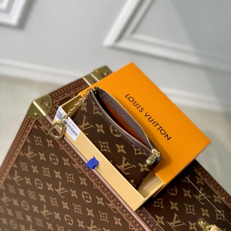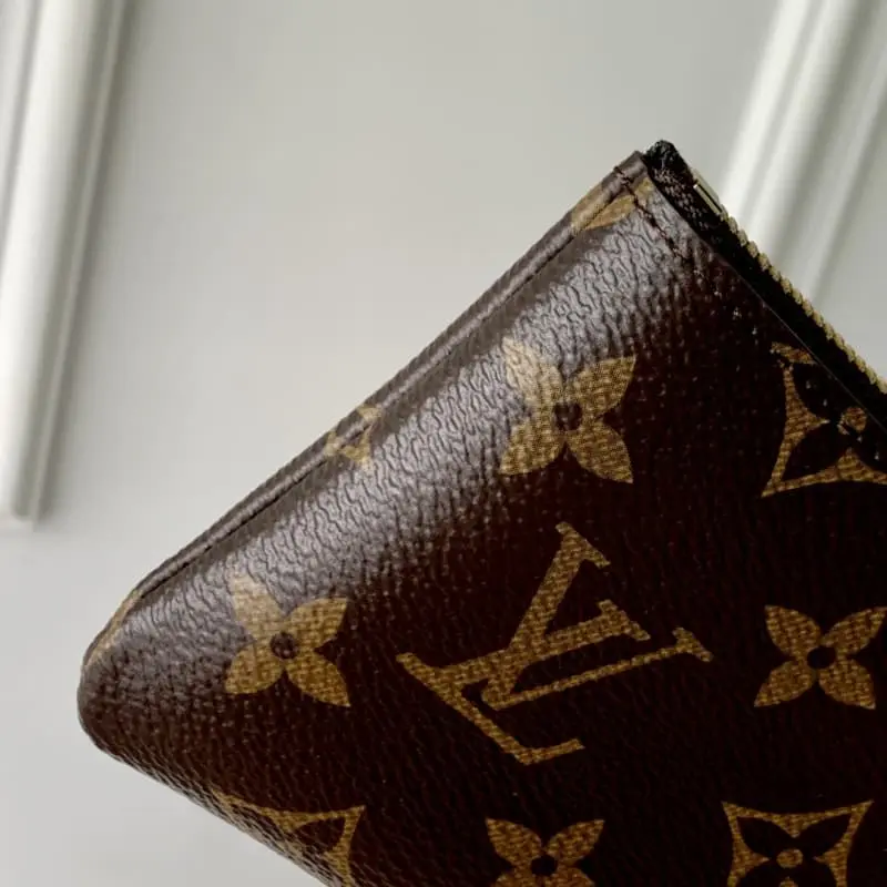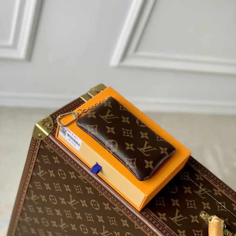 M13559 This compact coin purse is the latest model in the Pochette Cl??s series created in 1984 and is designed to store small necessities. Crafted from iconic Monogram coated canvas, it features a stylish gold-tone hook-and-chain strap with room for keys. The zipped pocket keeps bills and coins securely organized, and there’s also a credit card slot for added practicality. 15 x 9 x 1 cm (length x height x width)
