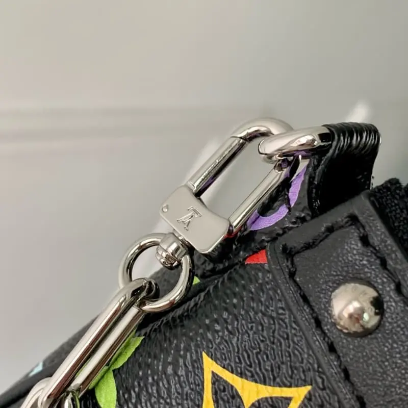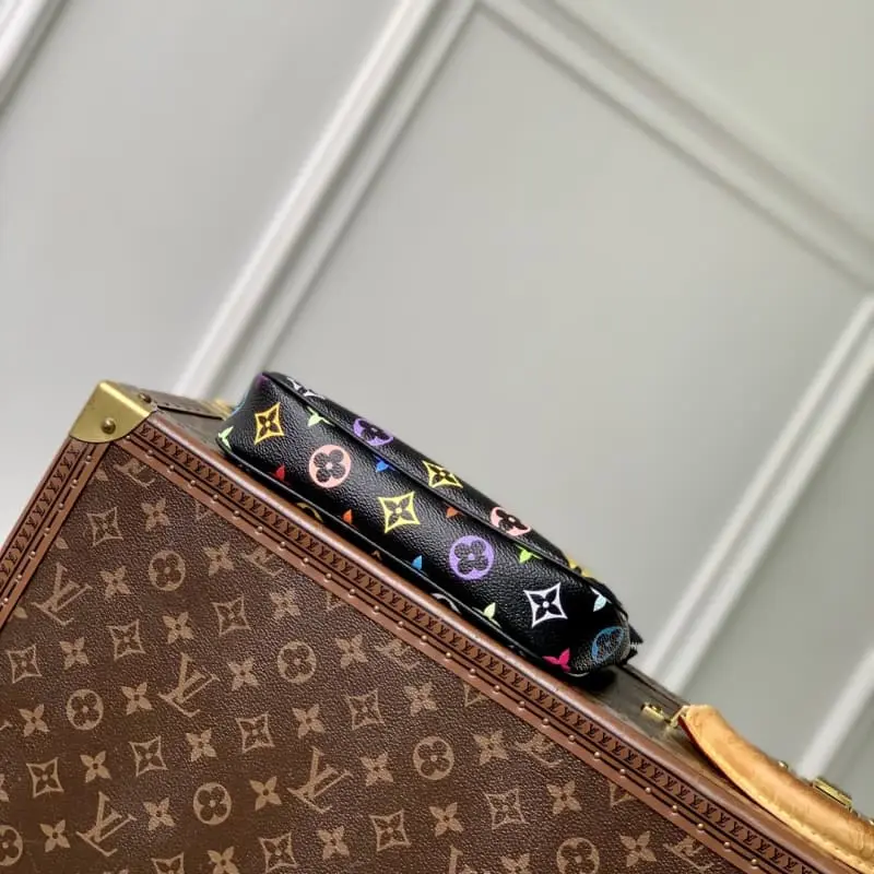 M13663 This Pochette Accessoires handbag is made of coated canvas with colorful Monogram patterns, interpreting the dynamic style of the Lbag x Takashi Murakami cross-border collaboration series. The cowhide trim and dazzling metal parts are the finishing touches. The removable shoulder strap and chain enable flexible carrying. 13 x 4 x 22 cm (height x width x length)