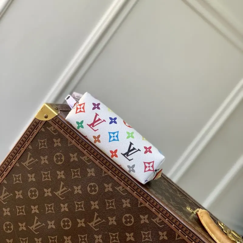 M13744 white color co-branded with Murakami Takashi! POCHETTE COSMETIQUE PM This compact cosmetic bag is made of Monogram canvas and can be easily inserted into a handbag. The round bag body and flat bottom design make it easy to take out and put in cosmetics. 19.0 x 12.0 x 6.0 cm (length x height x width)
