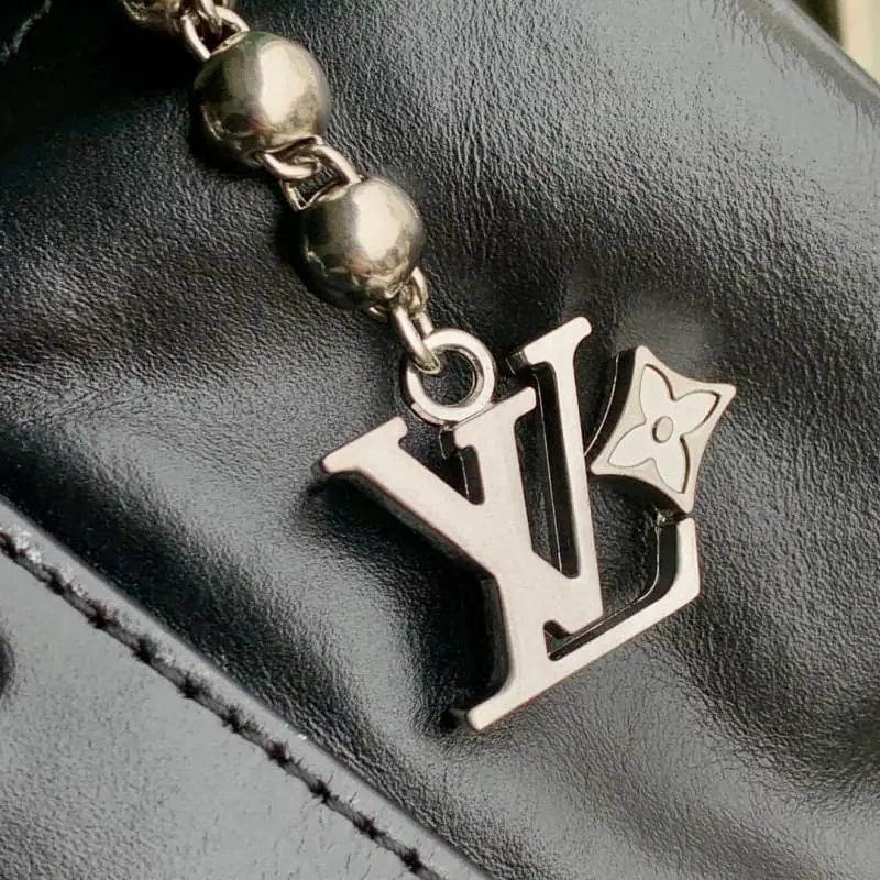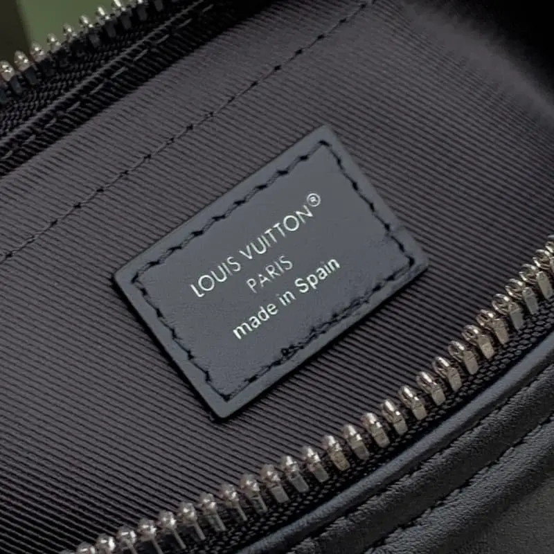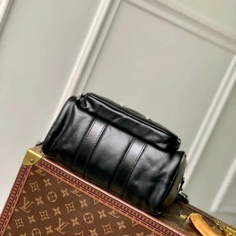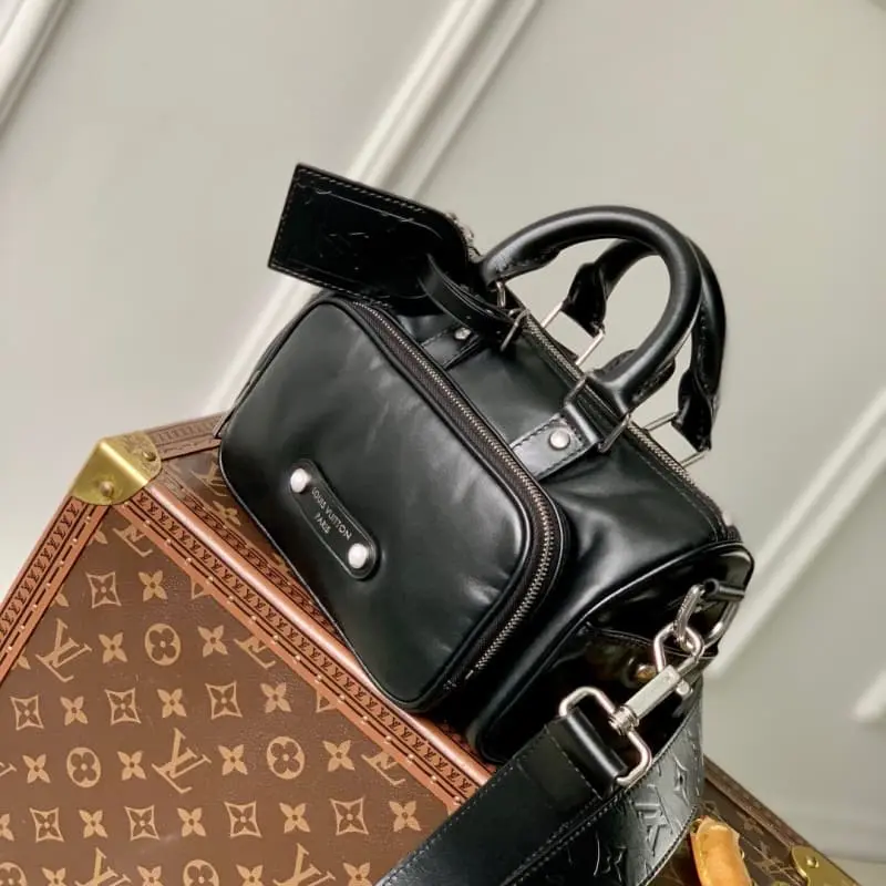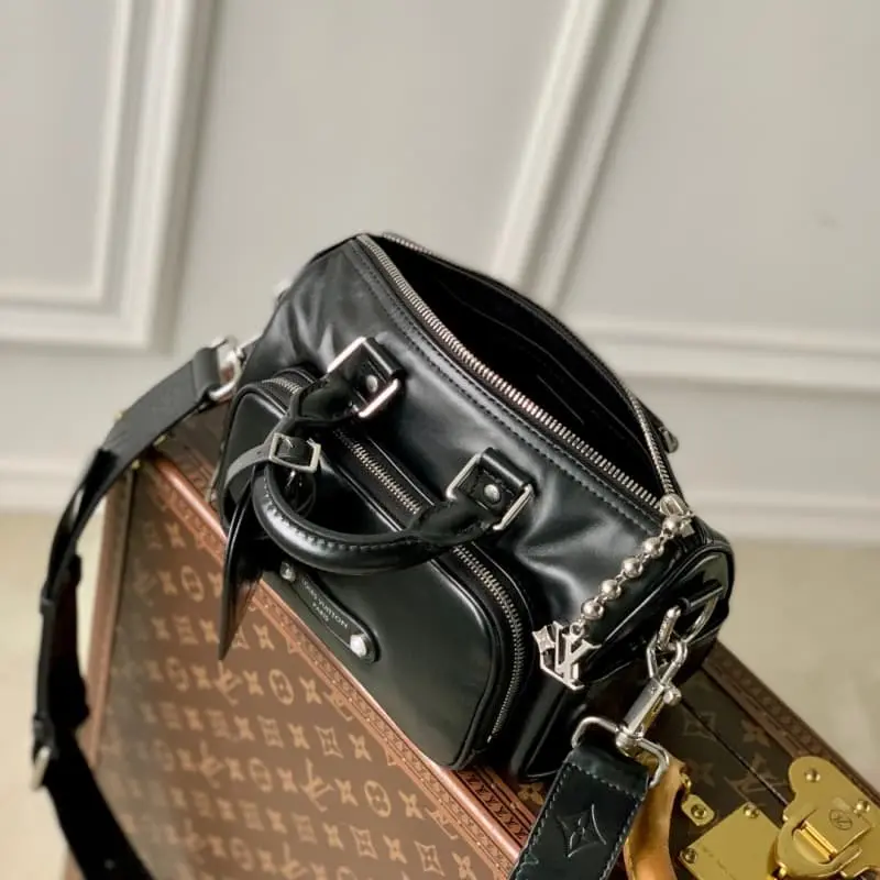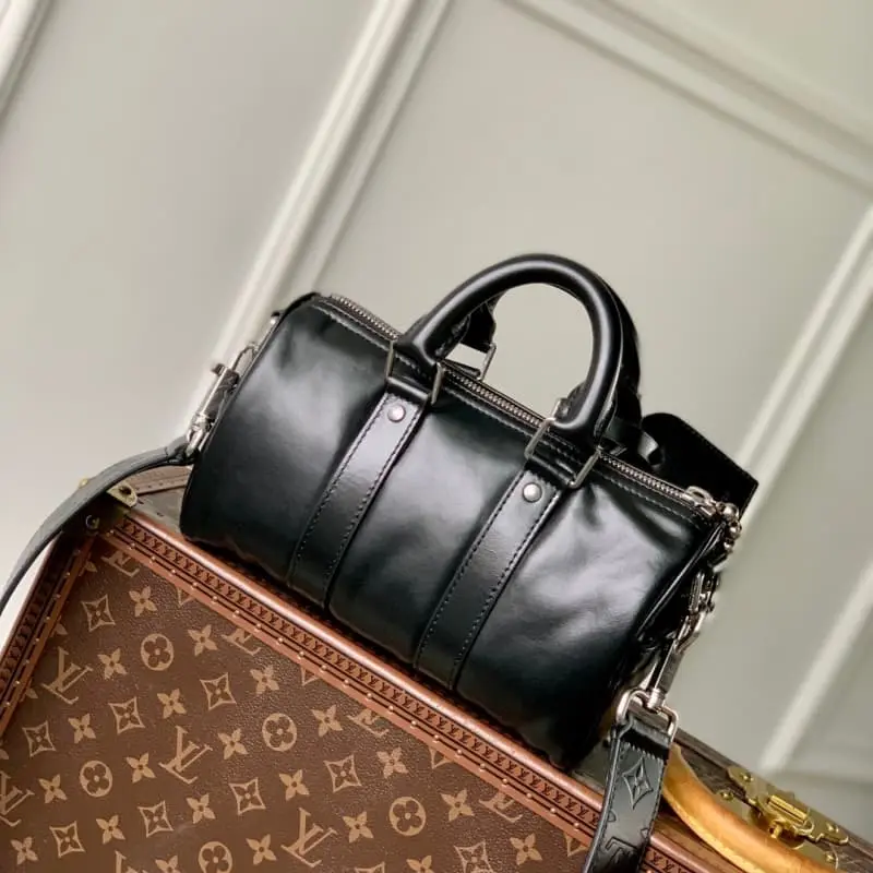 M13988 This Keepall Cargo Bandouli??re 25 bag is made of shiny cowhide leather. It conveys Pharrell Williams’s dandy aesthetic with an elegant and restrained urban design. The Lbag Paris patch is cleverly fixed to the body of the bag with beaded rivets. The zipper pull of the main compartment is decorated with LV letters. 15 x 11 x 25 cm (H x W x L)