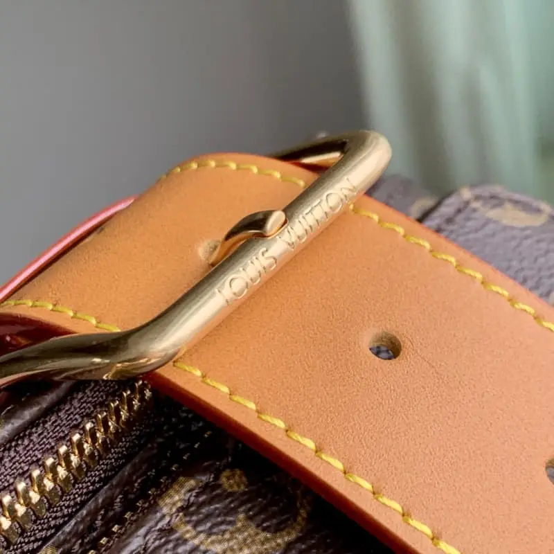 M14019 This Rush waist bag is made from soft Monogram canvas and combines functionality with a trendy feel. The beaded zipper pull opens the zippered front pocket to securely store your phone, keys and cards. A zippered main compartment provides a place for everyday essentials, while an adjustable strap and top leather handle add additional carrying options. 15 x 8 x 30 cm (height x width x length)