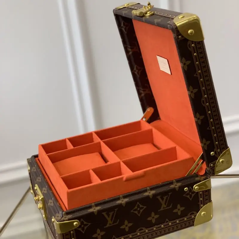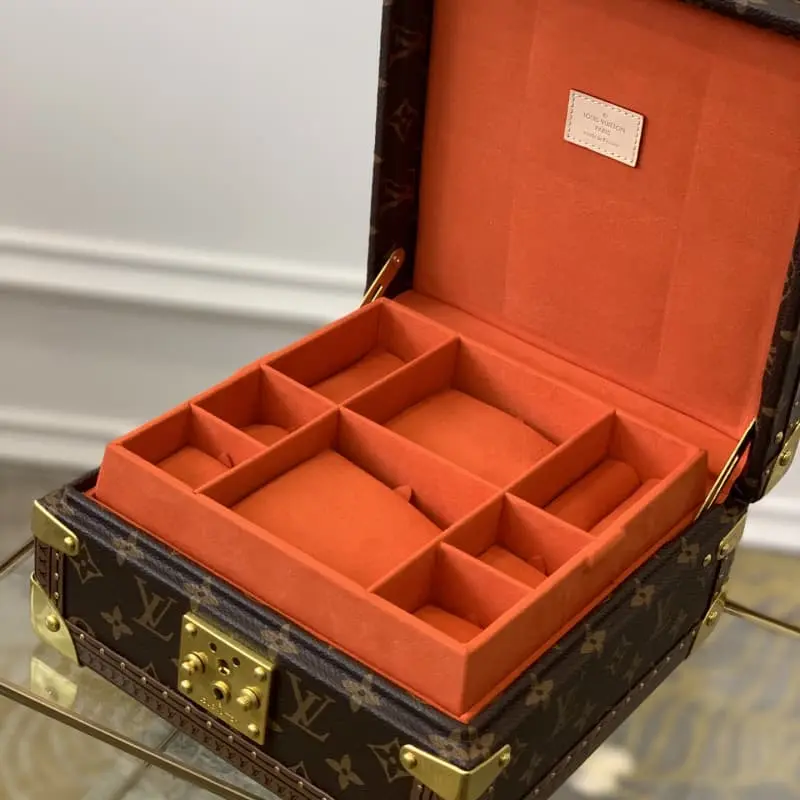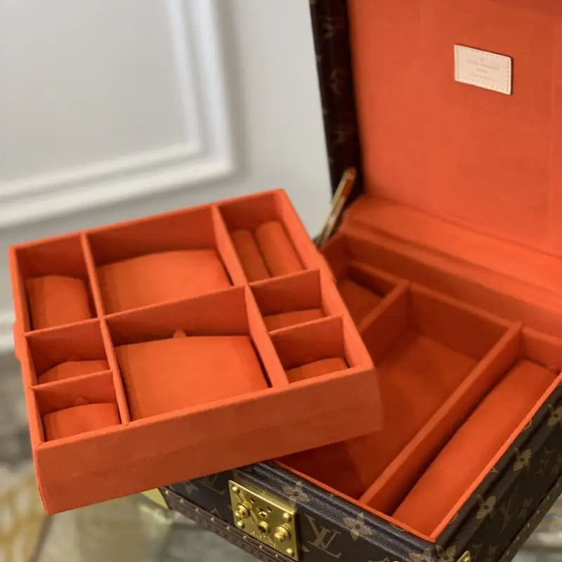 M20040 jewelry box orange can be layered and classified to store rings, necklaces, bracelets, earrings and bracelets. Equipped with small pads to ensure that jewelry is properly and comfortably stored. Elegant size, practical design, safe and secure, it is a good companion for traveling. size:23x11x23cm – length x height x width- 4 square compartments for earrings- 2 square compartments in the center for large earrings or bracelets/bracelets- 2 longer rectangular compartments for thinner and larger rings- 2 side compartments for bracelets and bracelets- 1 middle compartment for necklaces- Gold metal corners- Diamond pattern- Nail head decoration- S-shaped lock- Monogram canvas- Velvet lining- Gold metal
