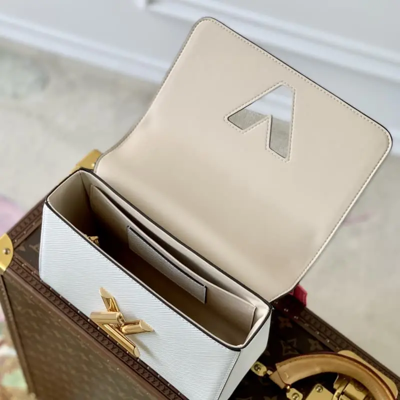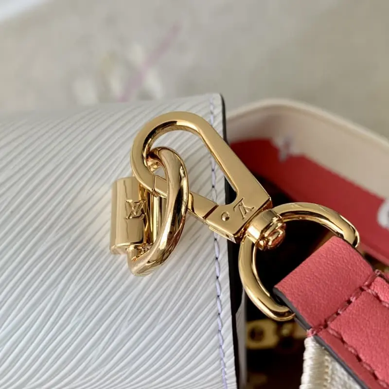 M20681 White Medium This medium Twist bag is made of Epi grain leather and is decorated with lemon shapes for a refreshing and vibrant look. The double-sided shoulder strap allows for flexible matching: one side of the fabric is embroidered with the Lbag logo, and the other side is dyed with a rich solid color. Dimensions: 23.0 x 17.0 x 9.5 cm (length x height x width)