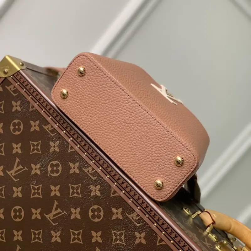 [Model M21045 Mini] Capucines Mini Handbag French imported calfskin, shiny metal accessories, unique Capucines flap can be put inside the bag to display the letter logo, or turned out to show the Monogram Flower pattern size: 21x14x8 cm