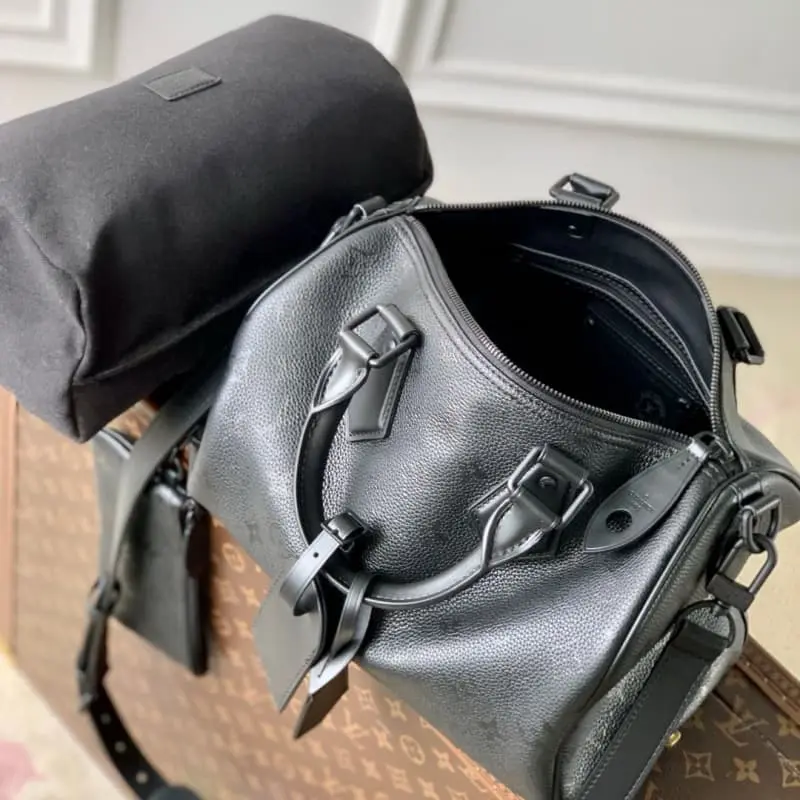 M21108 Black (Full Leather) This Speedy P9 Bandouli??re 30 Monogram leather handbag conveys a luxurious texture with soft cowhide leather. The Monogram print imitates the Monogram elements on the canvas. Polished metal parts, sheepskin lining and built-in label highlight the creative director Pharrell Williams’s attention to detail. Dimensions: 30 x 17×21 cm (length x height x width)