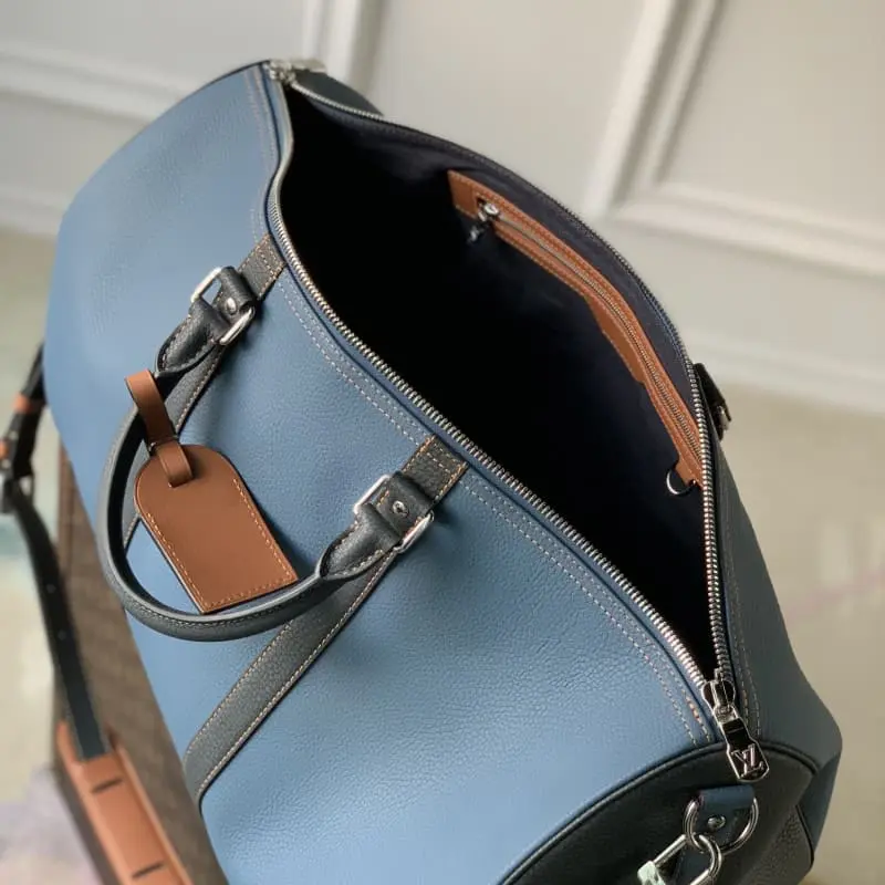 M21377 This Keepall Bandouli??re 50 travel bag features a Taurillon leather body in different shades of denim, with eye-catching stitching, LV letters and leather brand sewn on the side, exuding a leisurely and elegant charm. Detailed Features 50 x 29 x 23 cm (length x height x width)